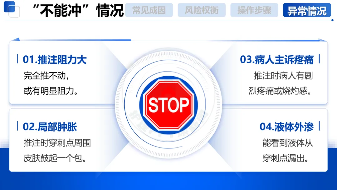 推注阻力大、完全推不动、患者主诉剧烈疼痛、液体外渗,出现这些情况立即📒停止冲管,重新评估。