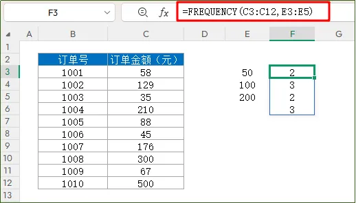 =FREQUENCY(C3:C12,E3:E5)C3:C12:需统计分析的一组数字E3:E5:划分区间的临界点
