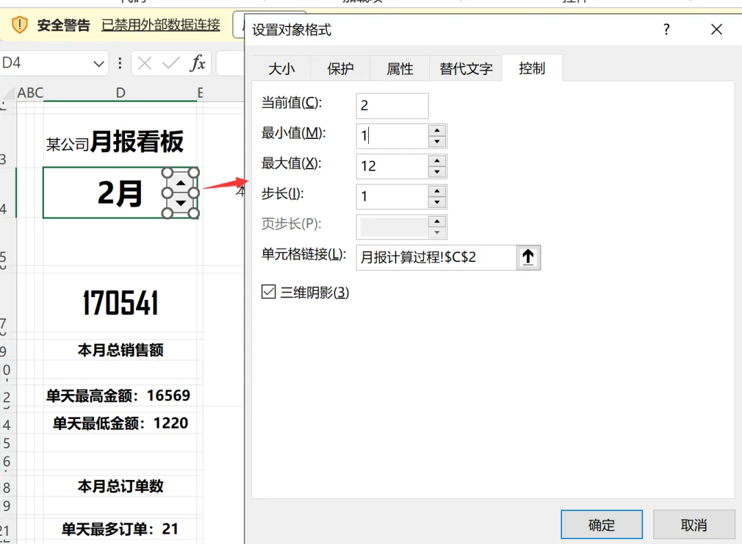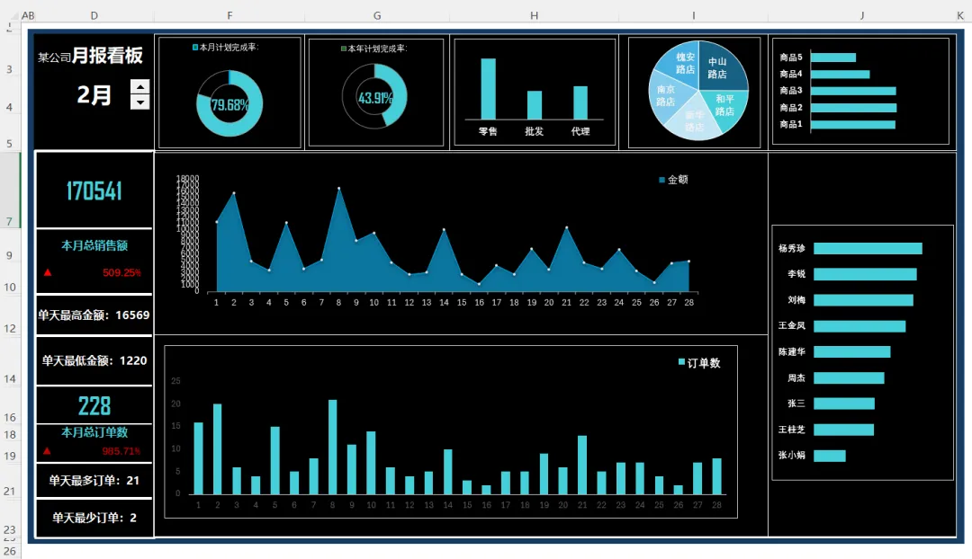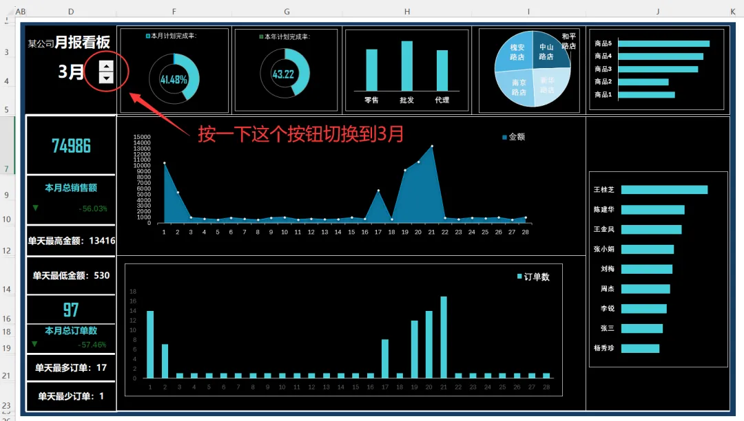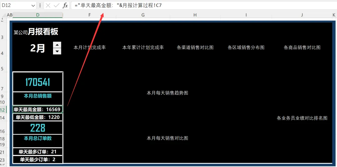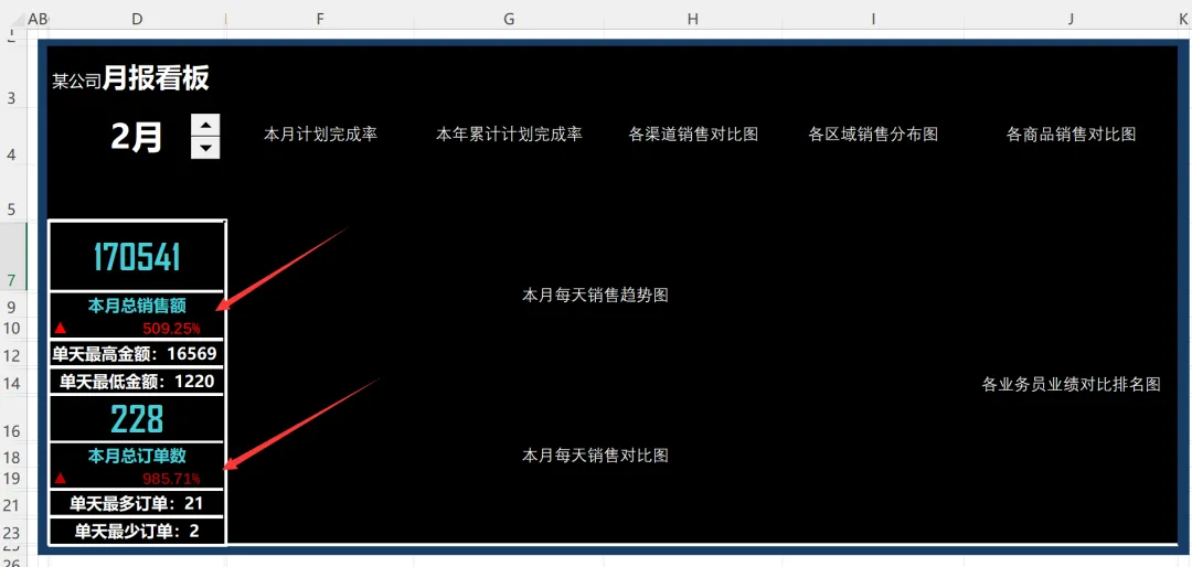 上一节,我们完成了月报制作过程里所有统计指标的可视化,今天我们来整合并组织数据和图表至看板中,调整配色并美化。在 Excel 工作簿的 “月报看板” 工作表中,把 “月报计算过程” 工作表中计算好的关键指标数据和动态图表按照构建好的布局整合并组织在一起,下面分步骤讲解。1)填写月报看板的标题,使用 Excel 公式从 “月报计算过程” 工作表引用算好的核心指标数据至 “月报看板” 工作表中,如下图所示。没错,这里面的所有数据都是引用的,来自月报计算过程那张表。2)插入控件按钮并设置控件格式。设置字体、字号,调整配色并美化,如下图所示。这个控件叫数值调节钮,是在开发工具里的。之前的日报和周报里分别介绍过添加方法,这里不再赘述。显示数据见以下公式,这里的引用,比起前面的准备工作,就太太太简单了。3) 从 “月报计算过程” 工作表中复制数据可视化元素的图片链接至月报看板中,具体设置方法在日报制作中有详细介绍,设置完毕后效果如下图 所示。其实就是增加了以下箭头所指的变化比例和标识。这个用到的知识点是粘贴成带链接的图片。日报和周报里也都有介绍。4) 按照构建好的看板布局,把做好的动态商务图表从 “月报计算过程” 工作表复制到月报看板中,并锚定在对应的单元格区域中,效果如下图所示。啊, 太不容易了,成品终于出炉。这是周末加好几个夜晚,认真做好每一步,出来的成品效果,还算满意。这样就完成了月报看板的制作,并用数据建模进行了自动化数据分析和动态展示。在实际工作中,可以根据企业的业务需要在月报看板中添加更多的核心指标或商务图表,指标数据计算及图表制作原理与此案例相同。来,我们看下展示效果。上图是2月的数据,我们可以点上面的按钮切换到3月,所有统计数据都对应改变,就是下面的效果。看起来是不是成就感满满!转眼到了4月,正好也要进行月度汇报了,我决定用这个模版在3月的月度汇报里练练手,看下能不能惊艳我的领导。也希望这几天的分享对大家有所帮助。