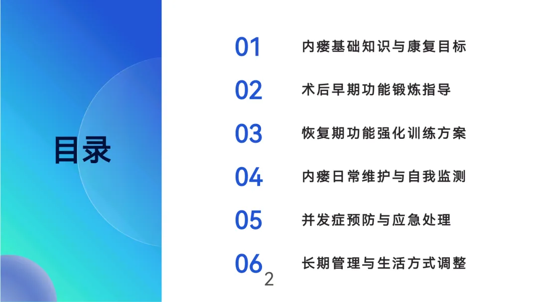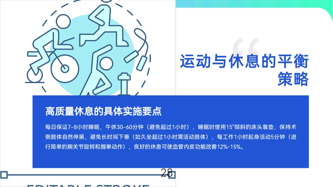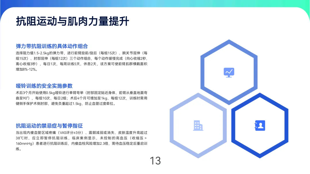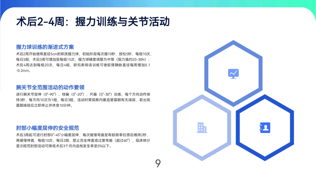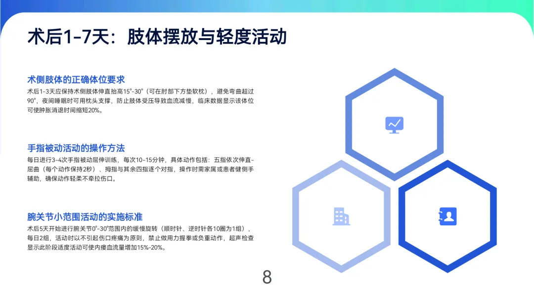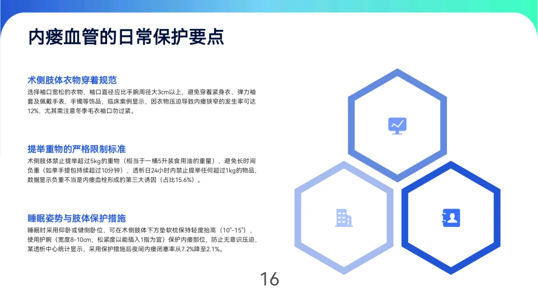 血管保护:穿着宽松衣物,避免术侧肢体提举>5kg重物或长时间受压,睡眠时保持轻度抬高(10°-15°)。