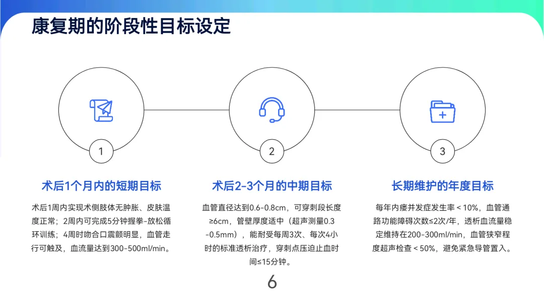 内瘘通过动静脉吻合形成永久性血管通路,成熟需4-8周(糖尿病患者可能延长),我国透析患者使用率超85%。规范锻炼可提升成熟率23%,缩短成熟时间1-2周,使内瘘平均使用寿命延长至4.2年。康复目标分阶段:术后1个月内实现肢体无肿胀、血管震颤明显;2-3个月达到血管直径≥0.6cm、可穿刺长度≥6cm;长期维护需将年并发症发生率控制在10%以下。