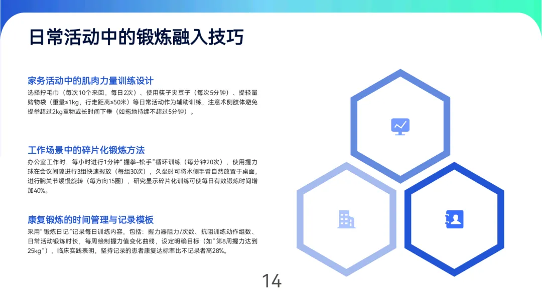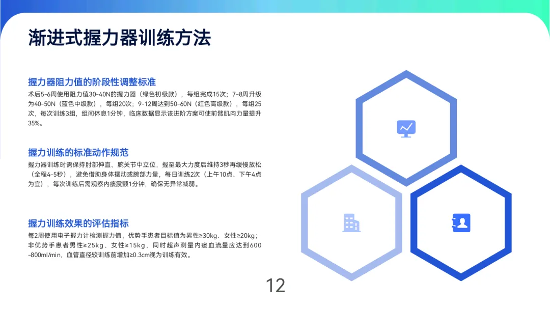 恢复期(5-12周):采用握力器阻力进阶训练(30-60N),配合弹力带抗阻运动(前臂旋前/旋后、腕肘屈伸),术后3个月可引入0.5-1kg哑铃训练。日常可通过拧毛巾、夹豆子等家务活动强化肌肉力量,锻炼时心率控制在(220-年龄)×50%-60%,以不引起疼痛为原则。