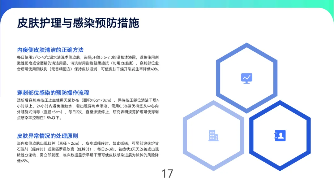 皮肤护理:每日用37-40℃温水清洁,穿刺点愈合后使用无香精润肤乳,出现红肿渗液时用0.5%碘伏消毒,感染风险可控制在1.5%以下。