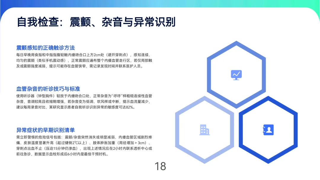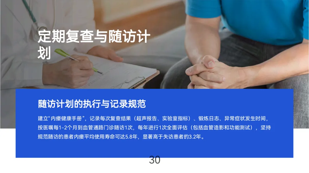 自我检查:每日触诊震颤(吻合口上方2cm处)、听诊杂音(“呼呼”样粗糙音),若出现震颤减弱、杂音变调或肢体肿胀>3cm,需2小时内就医。