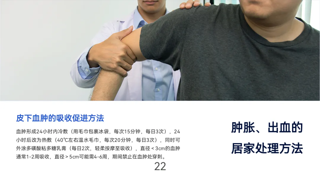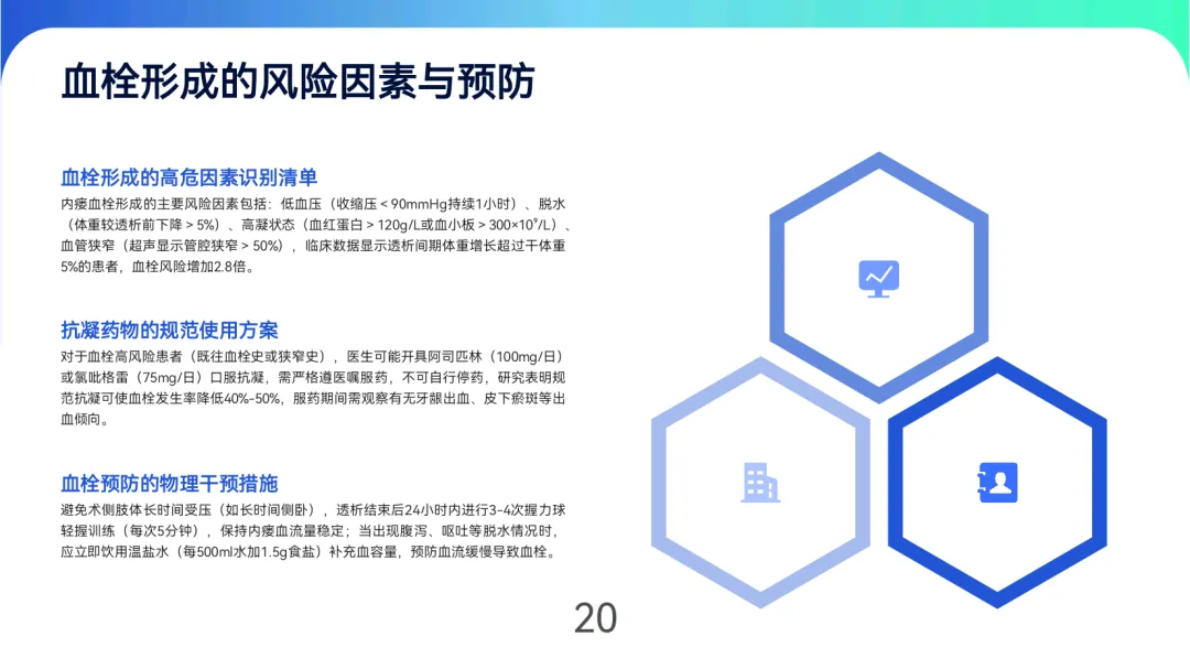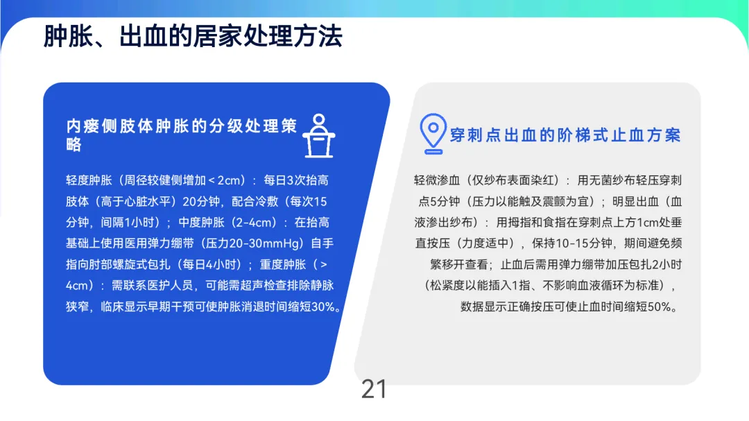 血栓高危因素包括低血压、脱水、高凝状态,需通过抗凝药物(阿司匹林100mg/日或氯吡格雷75mg/日)及握力训练预防,透析间期体重增长不超过干体重5%。肿胀分级处理:轻度抬高冷敷,中度加用弹力绷带,重度需超声排查狭窄穿刺点出血采用阶梯式按压(5-15分钟),止血后加压包扎2小时。出现血栓、严重感染(红肿>3cm伴发热)或出血不止时,需立即就医。