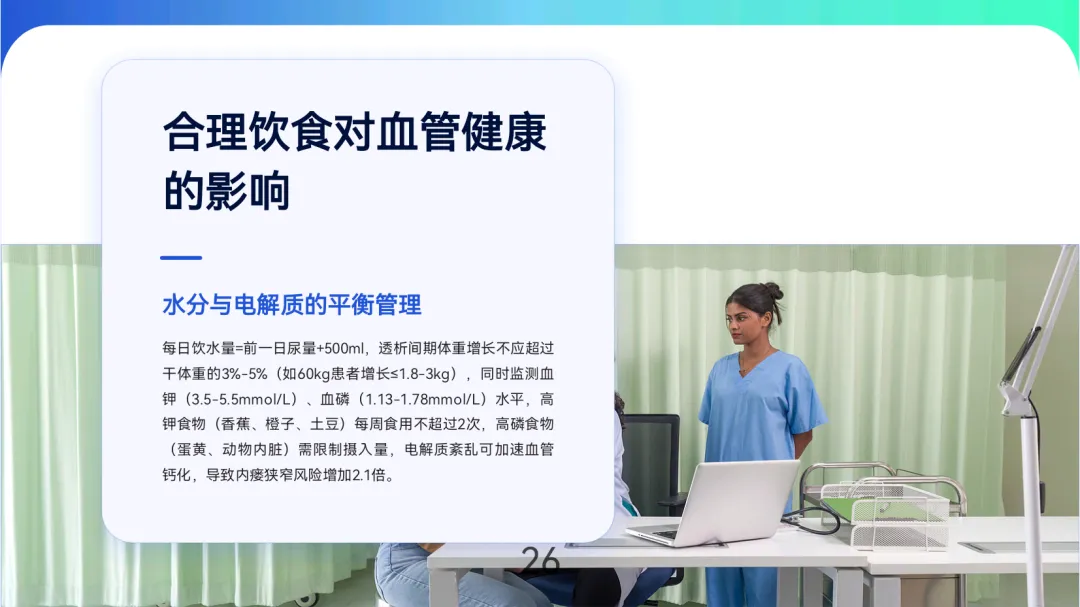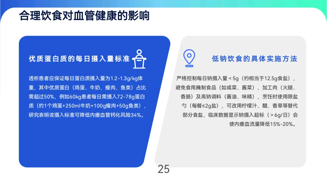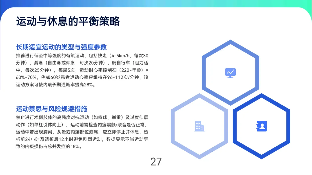 饮食上保证每日蛋白质1.2-1.3g/kg(优质蛋白占比>50%),钠摄入<5g/日,透析间期体重增长控制在3%-5%。运动以低中度有氧为主(快走、游泳,心率60%-70%最大心率),避免术侧肢体高强度活动。定期随访:每月查血红蛋白、白蛋白,每3个月超声评估血流量,每年全面血管造影,坚持随访者内瘘寿命可达5.8年,显著高于失访患者。