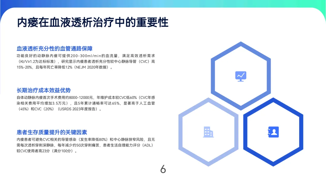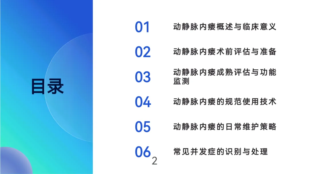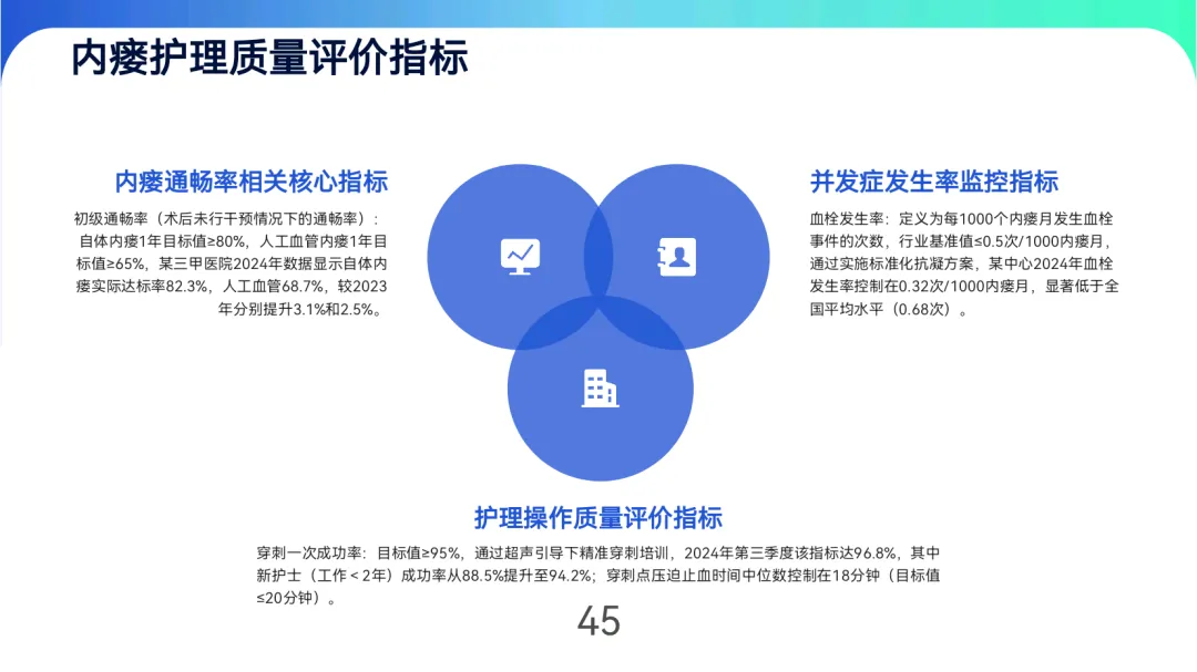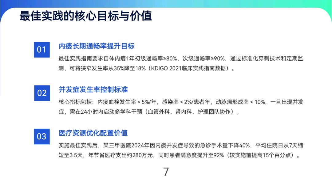 动静脉内瘘作为维持性血液透析患者的首选血管通路,其长期通畅性与规范管理直接影响治疗效果与患者生存质量。最佳实践的核心目标在于提升内瘘1年初级通畅率至≥80%,控制血栓、感染等并发症发生率,并优化医疗资源配置。