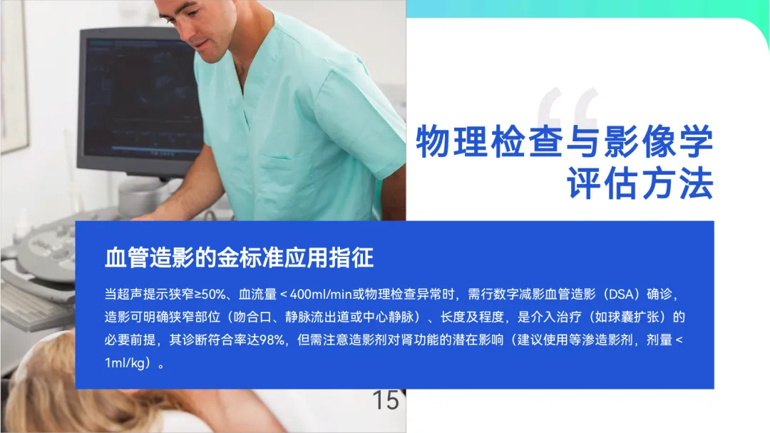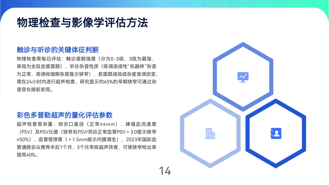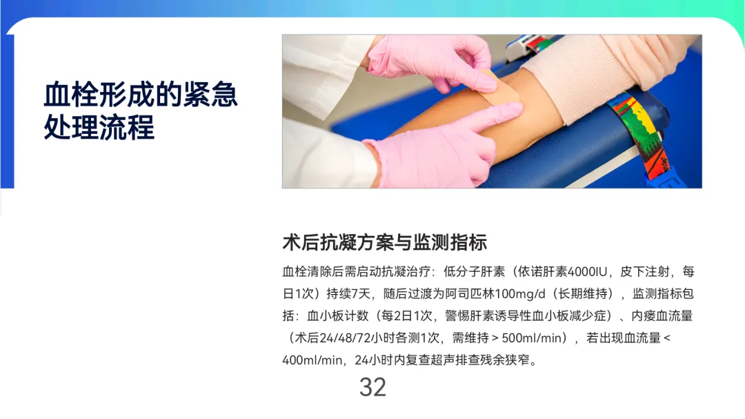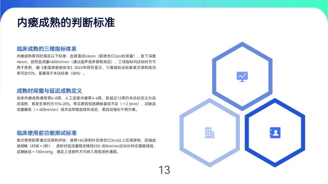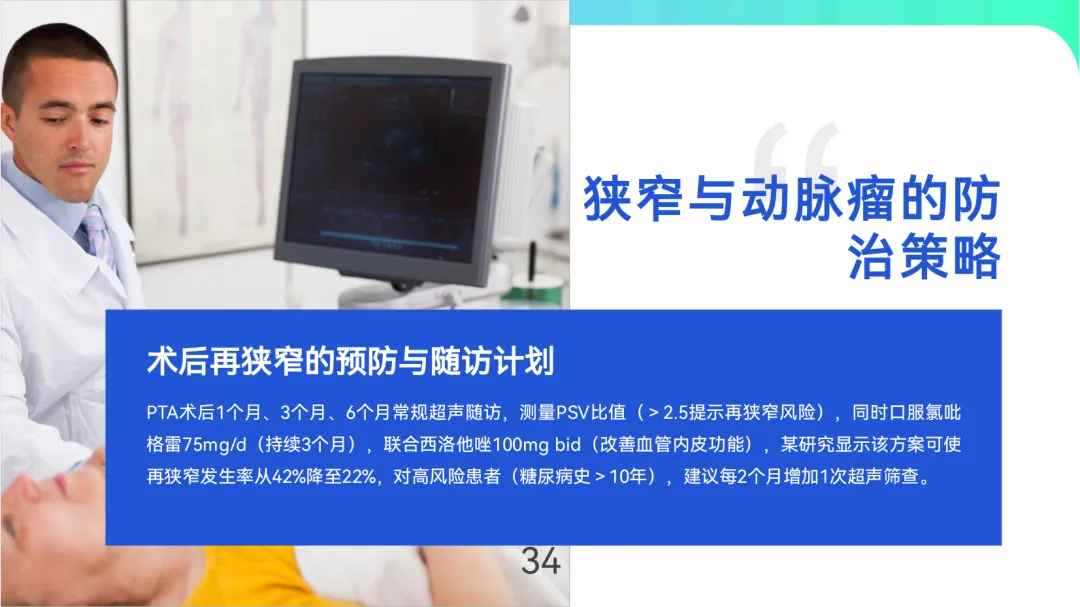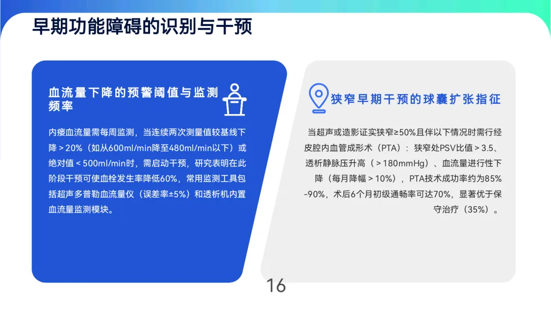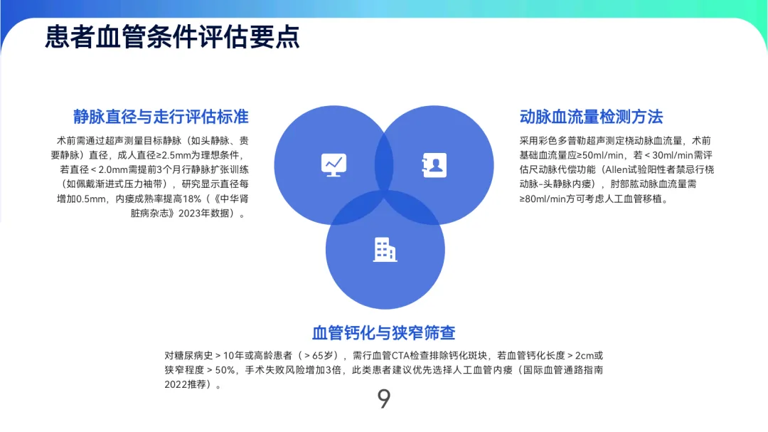 成熟评估与监测强调“三维指标”:血管直径≥6mm、皮下深度≤6mm、血流量≥600ml/min,自体内瘘成熟周期为6-8周,人工血管为4-6周。日常通过触诊震颤、听诊杂音及超声监测(如PSV比值>3.0提示狭窄)早期发现功能障碍,狭窄≥50%时需24小时内启动球囊扩张等介入治疗。