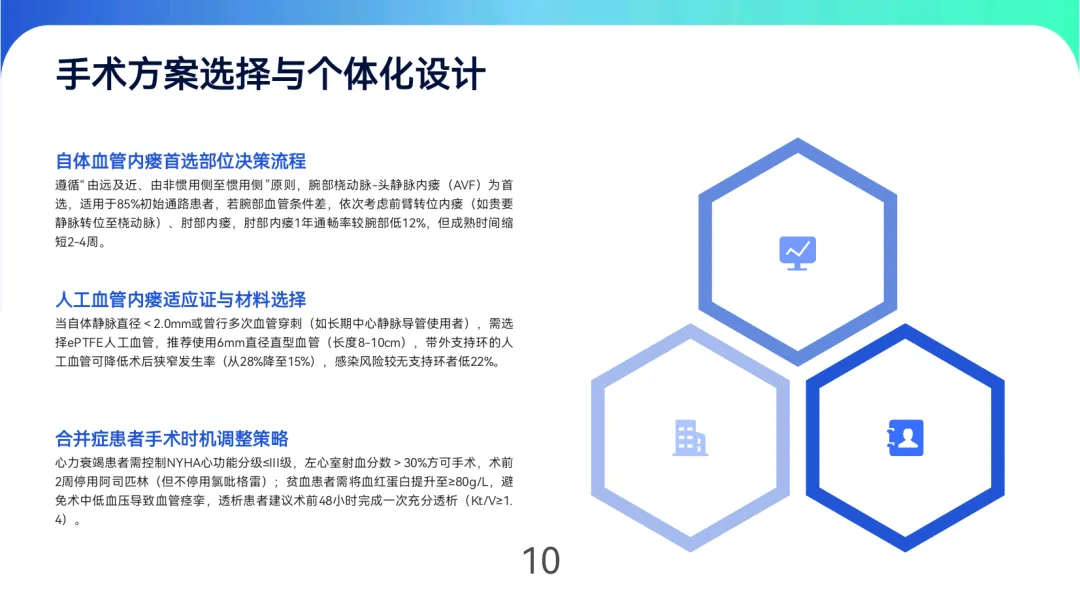 术前评估需通过超声等手段严格筛查血管条件,成人静脉直径≥2.5mm、动脉血流量≥50ml/min为理想指标,糖尿病或高龄患者需额外排除血管钙化风险。手术方案遵循“由远及近”原则,优先选择腕部桡动脉-头静脉内瘘,自体血管条件不足时采用ePTFE人工血管,合并心衰、贫血等基础疾病者需个体化调整手术时机。