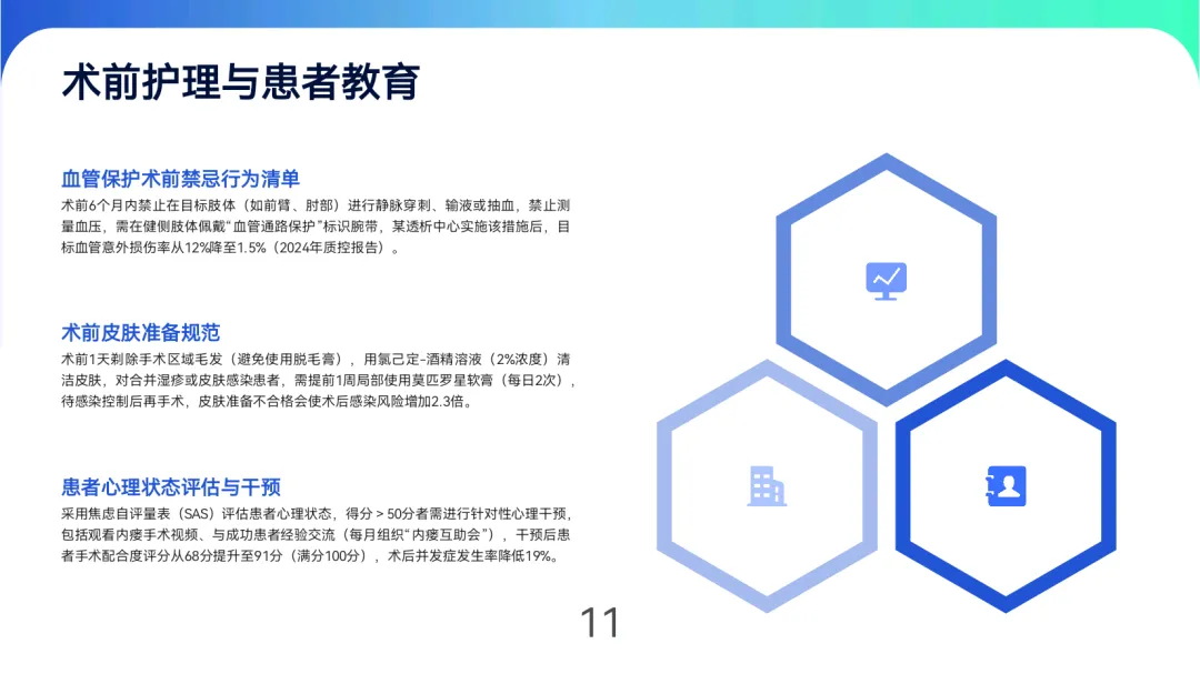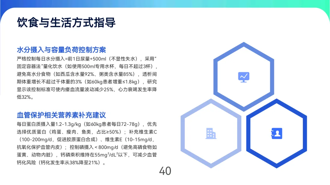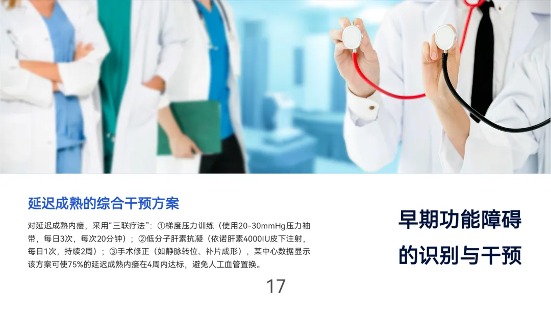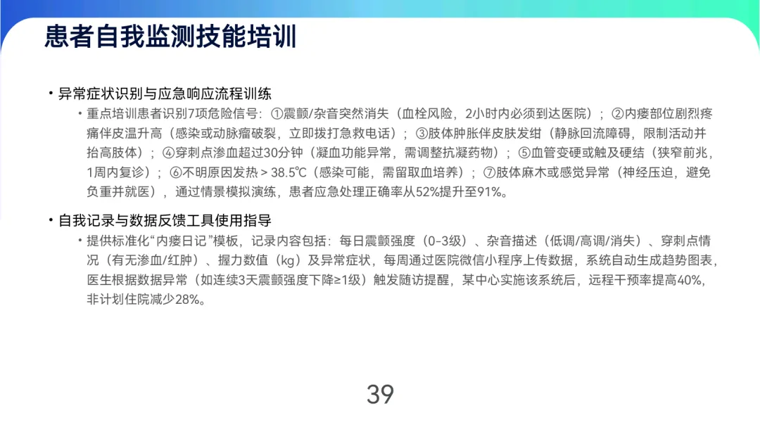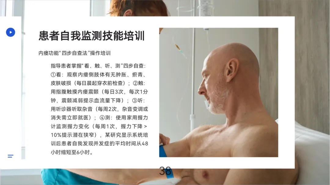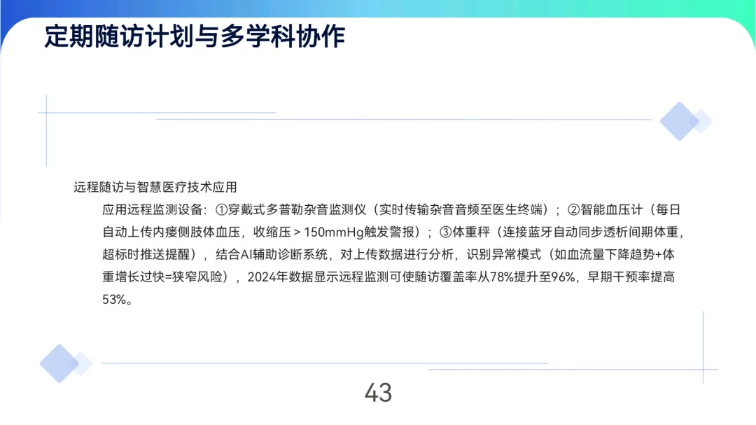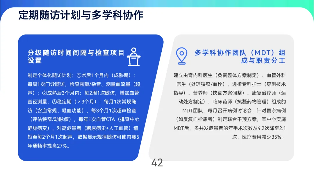 患者管理通过“四步自查法”(看、触、听、测)和7项危险信号识别培训,结合饮食控水(透析间期增重≤3%干体重)、安全运动(如每日散步30分钟)及定期随访(稳定期每3个月超声检查)实现长期维护。多学科团队(肾内科、血管外科等)协作与远程监测技术可降低年手术次数50%,提升5年通畅率27%。