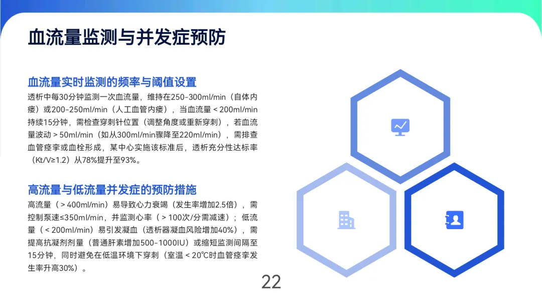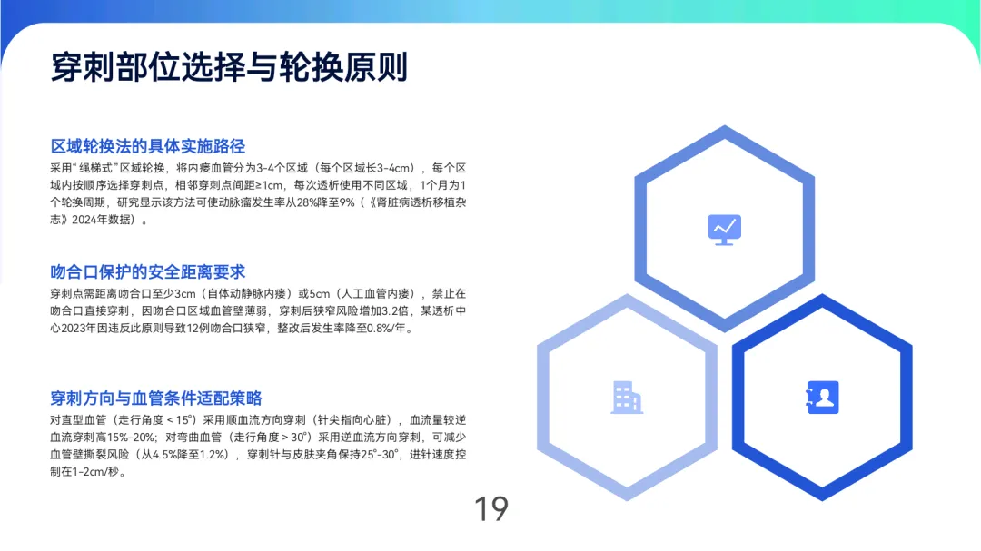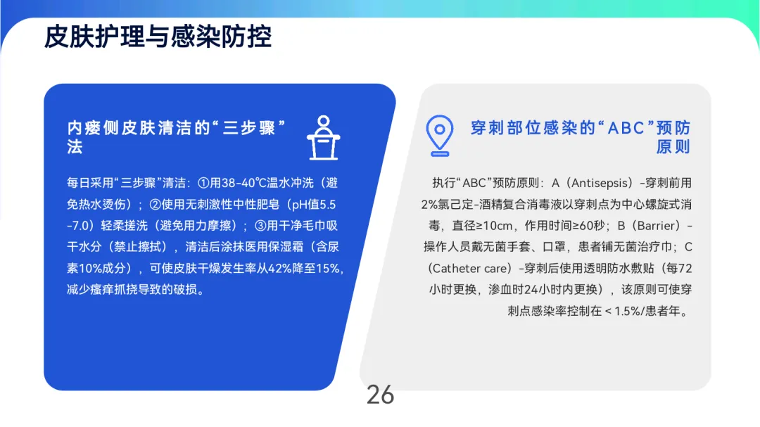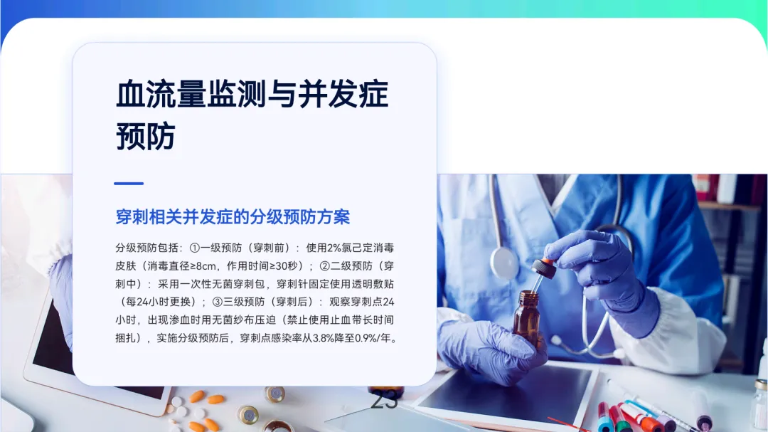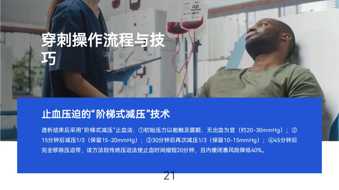规范使用技术包括“绳梯式”穿刺轮换(间距≥1cm)、距吻合口≥3cm安全距离,以及“阶梯式减压”止血法(45分钟完全减压)。透析中需维持血流量250-300ml/min(自体)或200-250ml/min(人工血管),每30分钟监测并预防高流量心衰、低流量凝血等并发症。