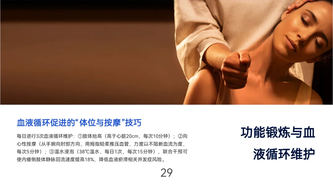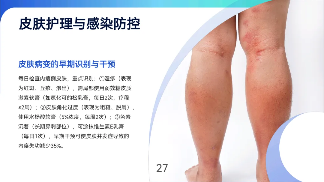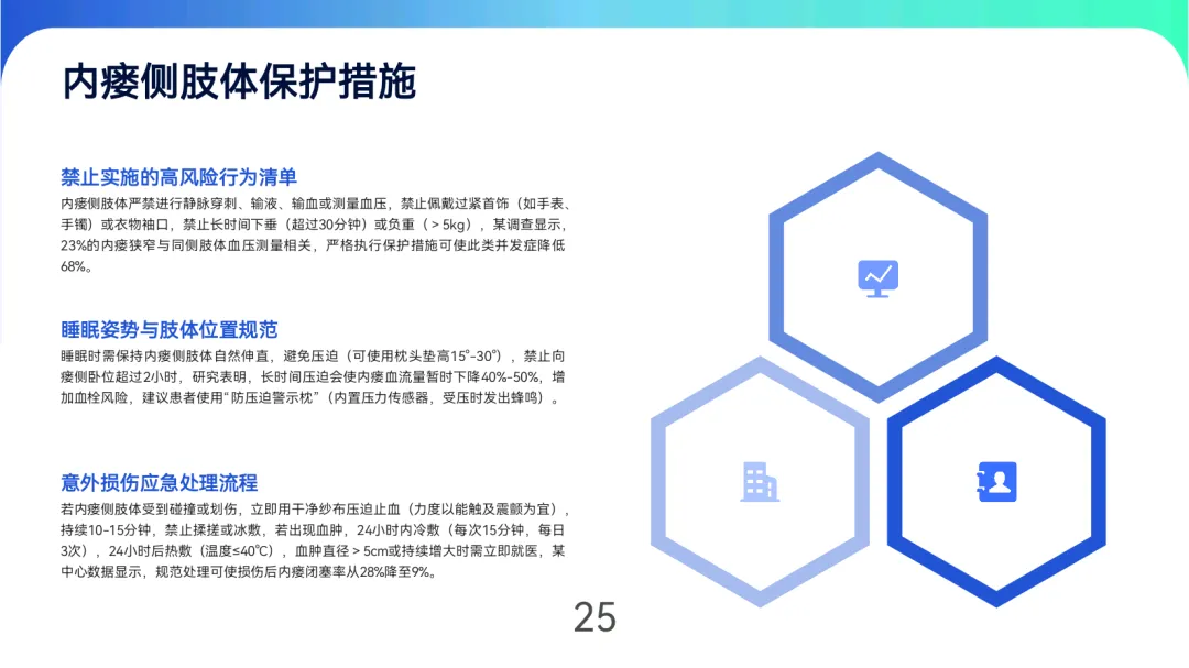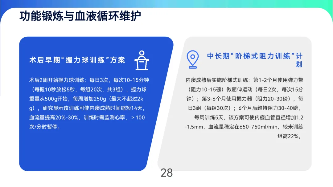 日常维护需严格保护内瘘侧肢体,禁止输液、测压及负重,睡眠时避免压迫并维持适度体位。皮肤护理采用“三步骤”清洁法,配合保湿与感染防控;功能锻炼分阶段进行,术后握力球训练可缩短成熟时间2-4周,中长期阻力训练提升血流量22%。