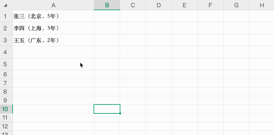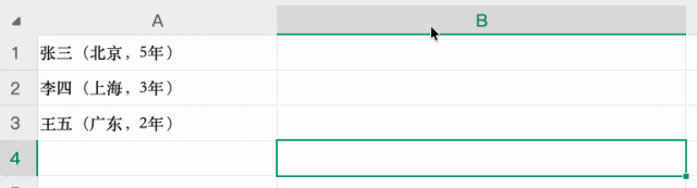 张三(北京,5年)李四(上海,3年)王五(广东,2年)