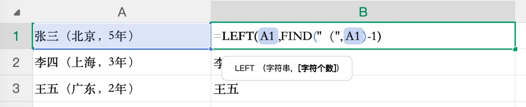 =LEFT(A1,FIND("(",A1)-1) A1 表示需处理的数据 - 3↩︎回车后,双击右下角十字填充柄,整列搞定🎉