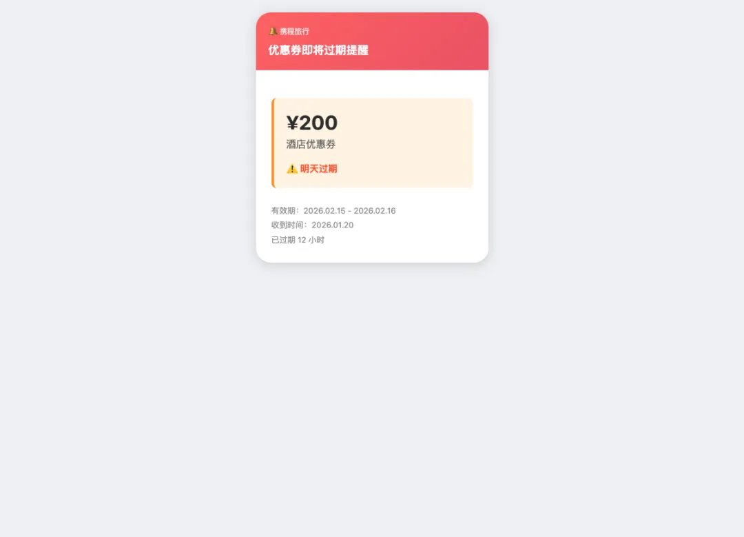 "您有一张 200 元优惠券即将过期,请尽快使用。"
