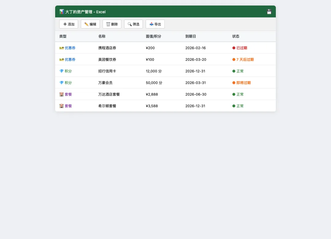 图 2:大丁的资产管理 Excel 表格,手动更新,无自动提醒,已过期券显示红色