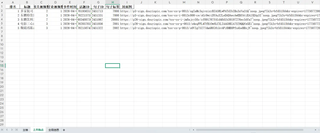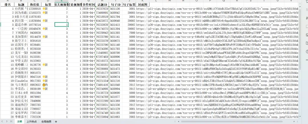import requestsimport timeimport pandas as pdfrom datetime import datetimeclass DouyinHotlist: def __init__(self, cookie: str, max_retries: int = 3, save_excel: bool = True): self.cookie = cookie self.max_retries = max_retries self.save_excel = save_excel self.data = None def fetch(self) -> dict: base_url = "https://www-hj.douyin.com/aweme/v1/web/hot/search/list/" # 以下参数为固定模拟数据,无需修改 params = { "device_platform": "webapp", "aid": "6383", "detail_list": "1", "source": "6", # ... 其他固定参数 } headers = { "User-Agent": "Mozilla/5.0 ...", "Cookie": self.cookie, "Referer": "https://www.douyin.com/", # ... 其他固定请求头 } for attempt in range(self.max_retries): try: response = requests.get(base_url, params=params, headers=headers, timeout=15) response.raise_for_status() data = response.json() if data.get("data") and data["data"].get("word_list"): self.data = data if self.save_excel: self.save_to_excel() # 自动保存Excel return data else: print(f"警告: 接口返回数据格式异常,尝试重试... (第{attempt+1}次)") time.sleep(2) except Exception as e: print(f"请求失败: {e},正在重试... (第{attempt+1}次)") time.sleep(3) return None def save_to_excel(self, filename_prefix: str = "douyin_hotlist"): """ 将当前存储的热榜数据保存到 Excel 文件 :param filename_prefix: 保存的文件名前缀,默认 "douyin_hotlist" """ if not self.data: print("无数据可保存") return active_time = self.data['data'].get('active_time', '未知') timestamp = datetime.now().strftime("%Y%m%d_%H%M%S") filename = f"{filename_prefix}_{timestamp}.xlsx" with pd.ExcelWriter(filename, engine='openpyxl') as writer: # 1. 主榜 word_list = self.data['data'].get('word_list', []) if word_list: main_df = [] for idx, item in enumerate(word_list, 1): row = { '排名': idx, '标题': item.get('word', ''), '热度值': item.get('hot_value', 0), '浏览量': item.get('view_count', 0), '标签': self.get_label_text(item.get('label', 0)), '相关视频数': item.get('video_count', 0), '讨论视频数': item.get('discuss_video_count', 0), '事件时间': datetime.fromtimestamp(item.get('event_time', 0)).strftime('%Y-%m-%d %H:%M:%S') if item.get('event_time') else '', '话题ID': item.get('group_id', ''), '句子ID': item.get('sentence_id', ''), '句子标签': item.get('sentence_tag', 0), '封面图': item.get('word_cover', {}).get('url_list', [''])[0] if item.get('word_cover') else '' } main_df.append(row) df_main = pd.DataFrame(main_df) df_main.to_excel(writer, sheet_name='主榜', index=False) # 2. 实时上升热点 trending_list = self.data['data'].get('trending_list', []) if trending_list: trend_df = [] for idx, item in enumerate(trending_list, 1): row = { '排名': idx, '标题': item.get('word', ''), '相关视频数': item.get('video_count', 0), '讨论视频数': item.get('discuss_video_count', 0), '事件时间': datetime.fromtimestamp(item.get('event_time', 0)).strftime('%Y-%m-%d %H:%M:%S') if item.get('event_time') else '', '话题ID': item.get('group_id', ''), '句子ID': item.get('sentence_id', ''), '句子标签': item.get('sentence_tag', 0), '封面图': item.get('word_cover', {}).get('url_list', [''])[0] if item.get('word_cover') else '' } trend_df.append(row) df_trend = pd.DataFrame(trend_df) df_trend.to_excel(writer, sheet_name='上升热点', index=False) # 3. 全局信息 info = { '更新时间': active_time, '分享标题': self.data['data'].get('share_info', {}).get('share_title', ''), '分享链接': self.data['data'].get('share_info', {}).get('share_url', ''), '上升热点描述': self.data['data'].get('trending_desc', ''), '展示样式': self.data['data'].get('display_style', 0) } df_info = pd.DataFrame([info]) df_info.to_excel(writer, sheet_name='全局信息', index=False) print(f"数据已保存至: {filename}") def print_hotlist(self): """在控制台打印当前存储的热榜数据""" if not self.data: print("无数据可打印") return print("\n" + "="*70) print(f"📈 抖音热榜 - 更新时间: {self.data['data'].get('active_time', '未知')}") print("="*70) # 主榜 print("\n🔥 【热榜主榜】") for idx, item in enumerate(self.data['data']['word_list'], 1): word = item.get('word', '无标题') hot_value = item.get('hot_value', 0) label = item.get('label', 0) label_text = self.get_label_text(label) hot_str = self.format_hot_value(hot_value) print(f"{idx:3}. {word:<38}{label_text:>4} 热度: {hot_str:>12}") # 上升热点 print("\n\n📈 【实时上升热点】") trending = self.data['data'].get('trending_list', []) for idx, item in enumerate(trending, 1): word = item.get('word', '无标题') video_count = item.get('video_count', 0) discuss_count = item.get('discuss_video_count', 0) print(f"{idx:3}. {word:<50} 相关视频: {video_count} 个 | 讨论: {discuss_count} 个") @staticmethod def format_hot_value(value): """将热度值转换为万/亿格式""" if value >= 100000000: return f"{value/100000000:.1f}亿" elif value >= 10000: return f"{value/10000:.1f}万" else: return str(value) @staticmethod def get_label_text(label): """根据label值返回标签文字(热/沸/新/荐)""" label_map = { 1: "🔥热", 2: "💥沸", 3: "🌟新", 4: "👍荐" } return label_map.get(label, "")if __name__ == "__main__": # 请将下面的 COOKIE 替换为你最新的完整 Cookie YOUR_COOKIE = """ 你的完整Cookie字符串,请自行替换 """.strip() YOUR_COOKIE = " ".join(YOUR_COOKIE.split()) # 去除换行,整理为一行 douyin = DouyinHotlist(cookie=YOUR_COOKIE, save_excel=True) hot_data = douyin.fetch() if hot_data: douyin.print_hotlist() else: print("获取热榜失败,请检查 Cookie 是否过期。")