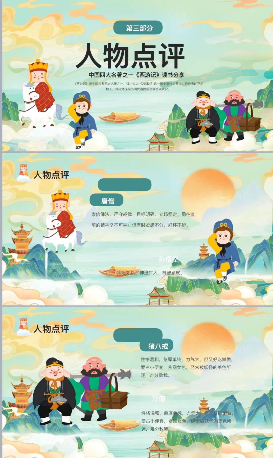 书中的主人公 —— 唐僧师徒四人,性格各异,形象鲜明。唐僧崇信佛法、严守戒律、目标明确、立场坚定,但有时贤愚不分、好坏不辨;孙悟空疾恶如仇、神通广大、机智顽皮;猪八戒性格温和,憨厚单纯,但好吃懒做,爱占小便宜,贪图女色;沙僧则憨厚老实,任劳任怨。他们四人性格互补,共同构成了一个团结协作的取经团队。