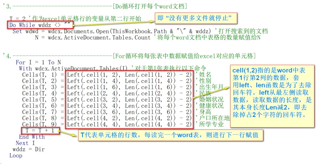 这一段代码的主要目的就是对excel表的第一行进行赋值,并填充表格颜色为绿色。第3、4部分:3、Do循环打开每个word文档;4、For循环将每张word表中数据赋值给excel对应的单元格