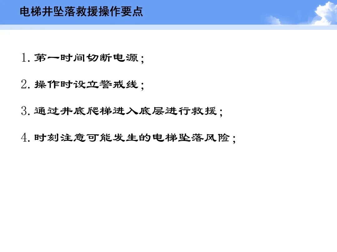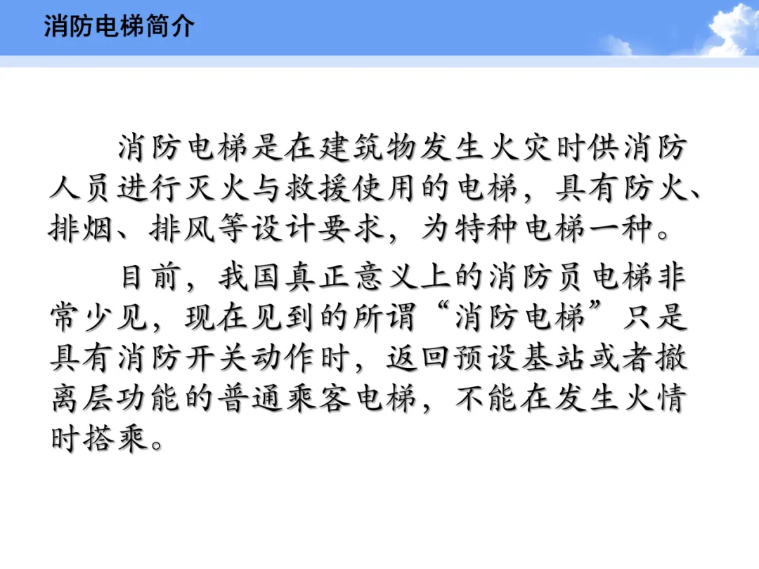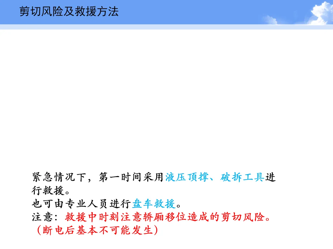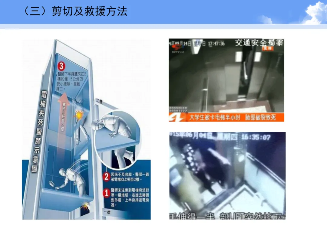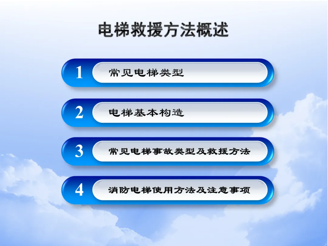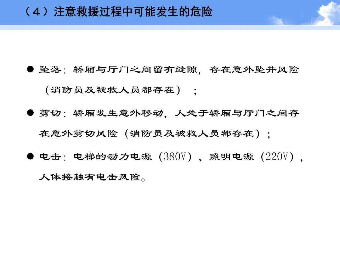 主旨内容:该课件介绍常见电梯类型(垂直、液压、自动人行道等)及基本构造,重点讲解轿厢困人、电梯井坠落、剪切等事故的救援方法,含轿厢位置确定、断电、警戒设置等操作要点,还说明了消防电梯的使用方法与注意事项,指导规范开展电梯救援工作。