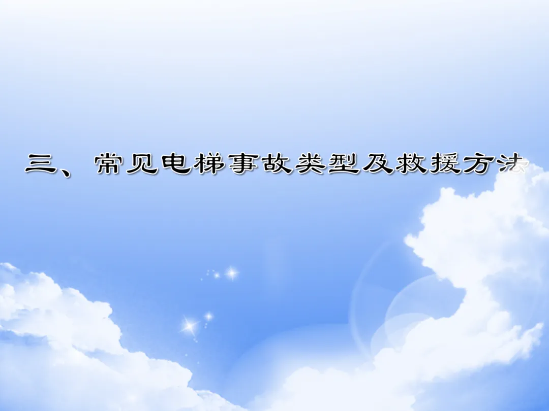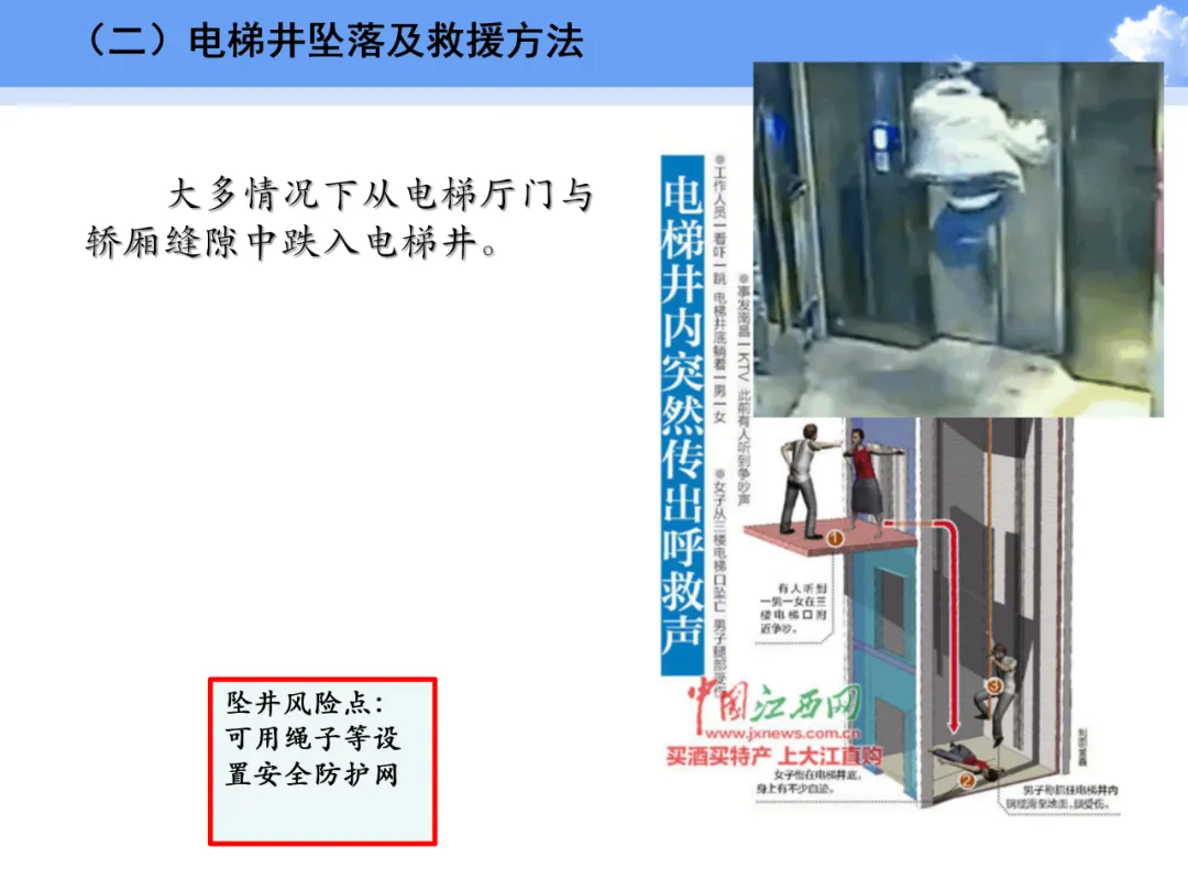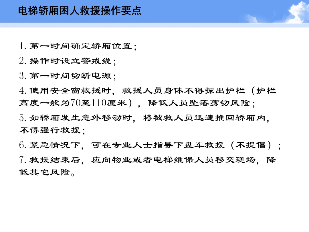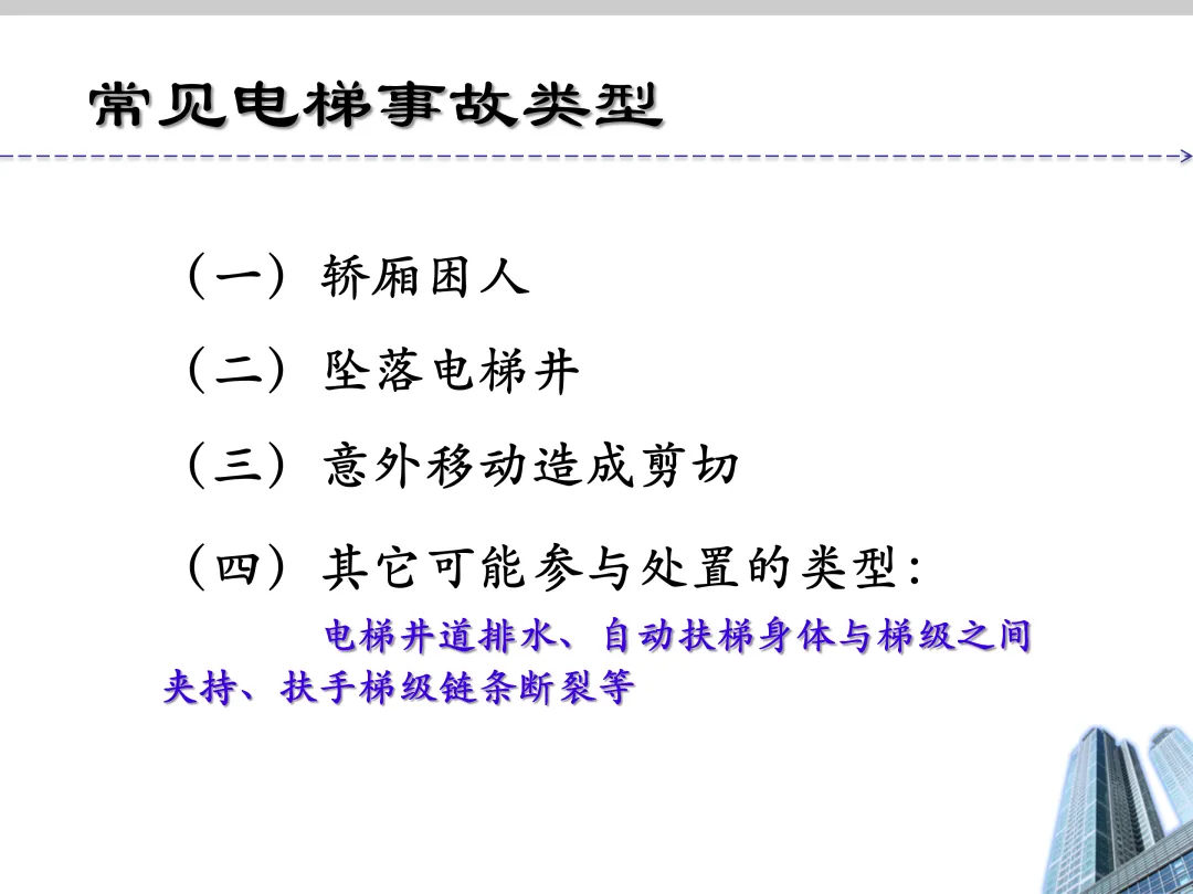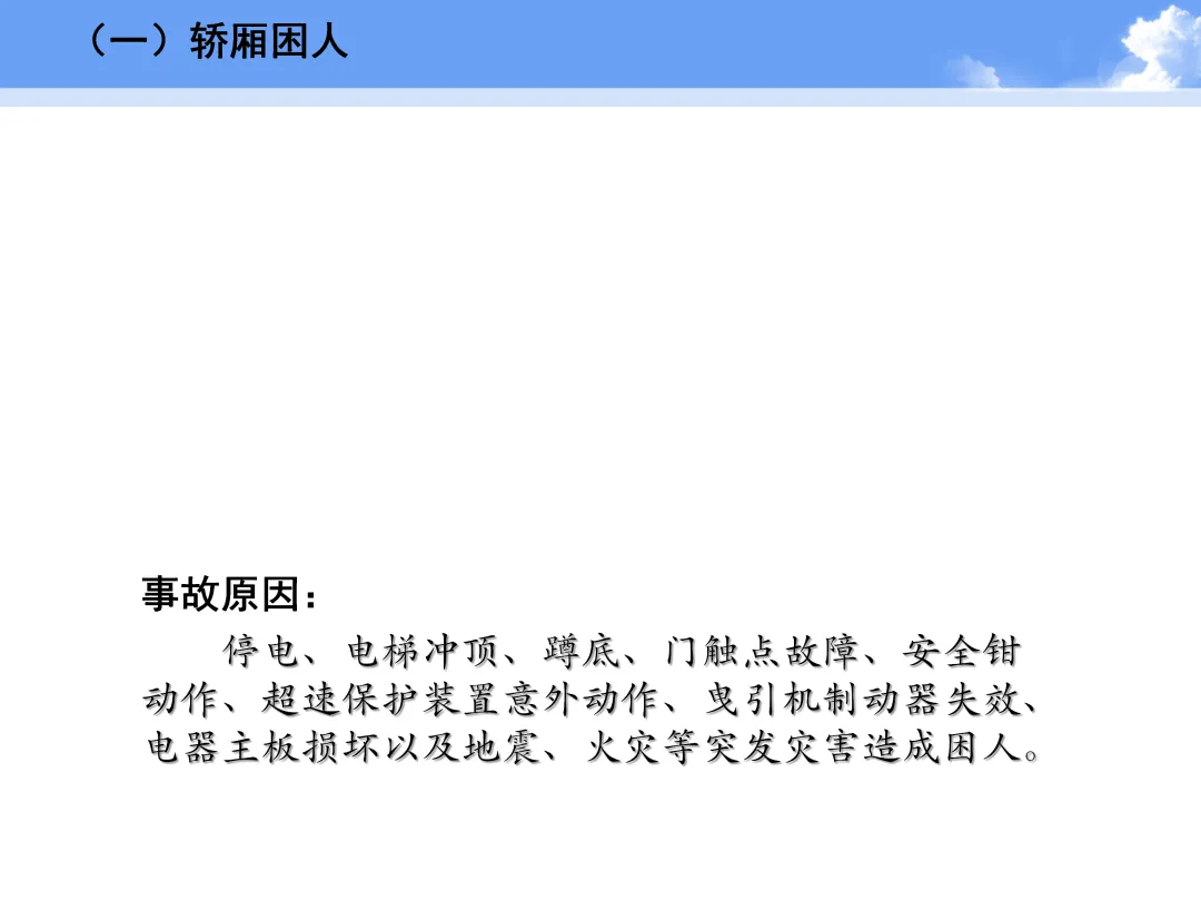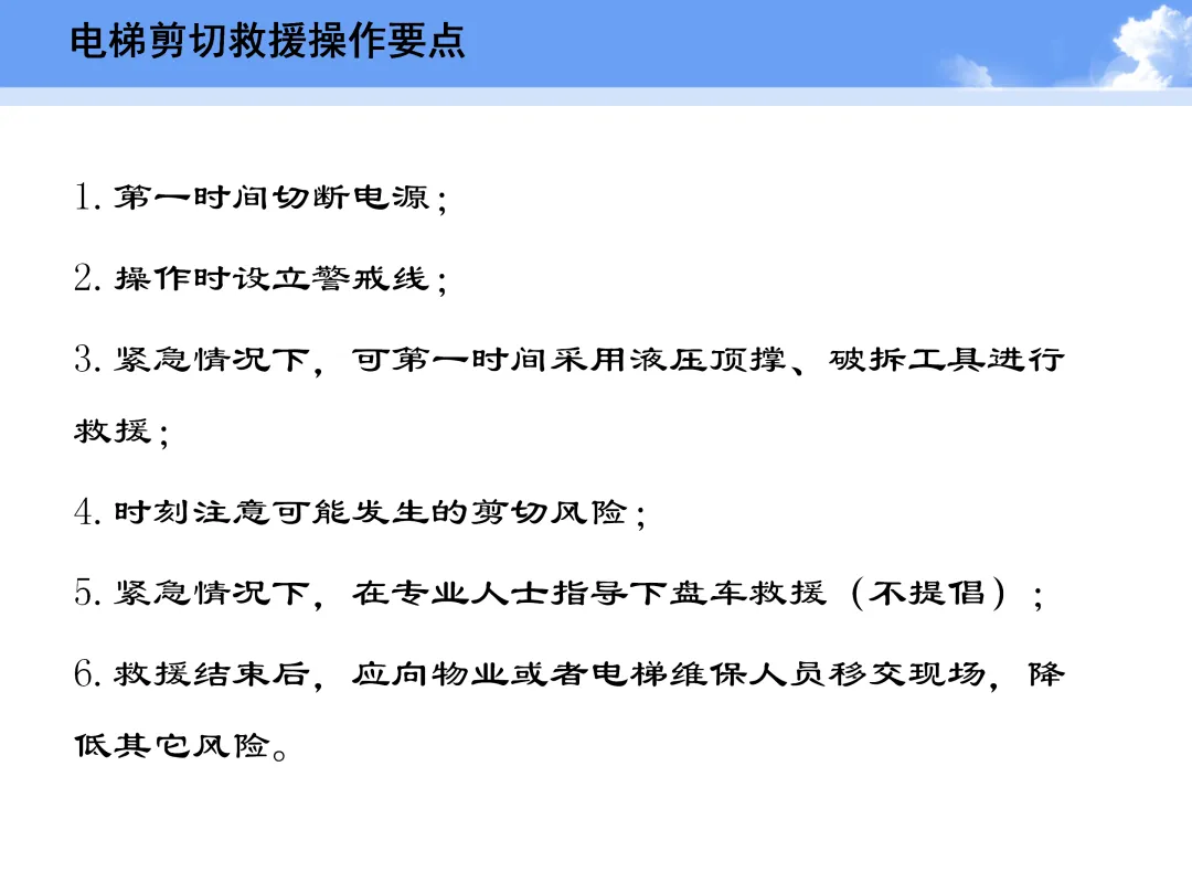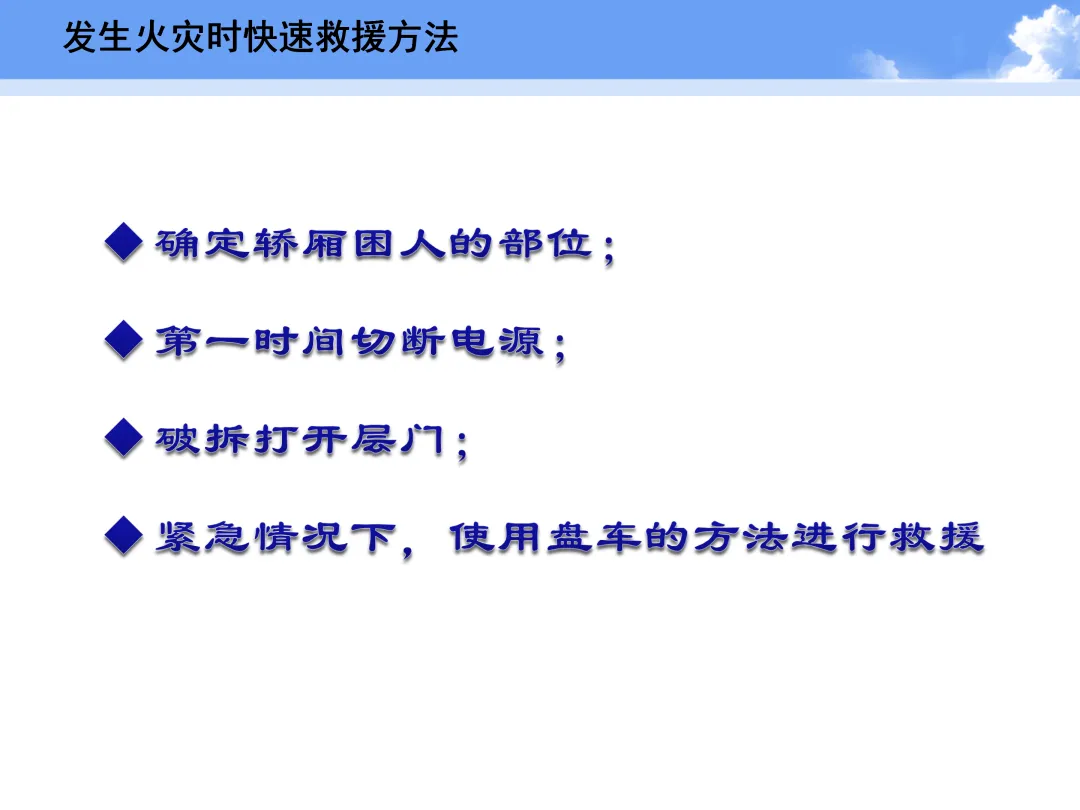 主旨内容:该课件介绍常见电梯类型(垂直、液压、自动人行道等)及基本构造,重点讲解轿厢困人、电梯井坠落、剪切等事故的救援方法,含轿厢位置确定、断电、警戒设置等操作要点,还说明了消防电梯的使用方法与注意事项,指导规范开展电梯救援工作。