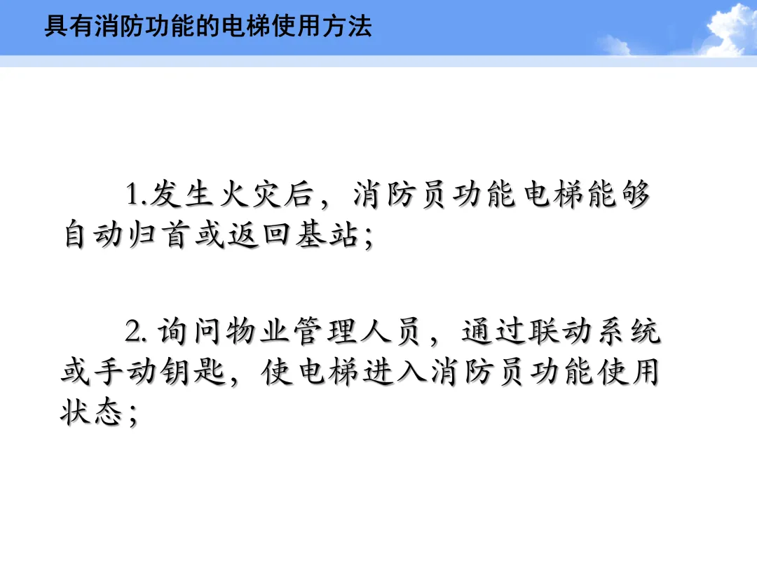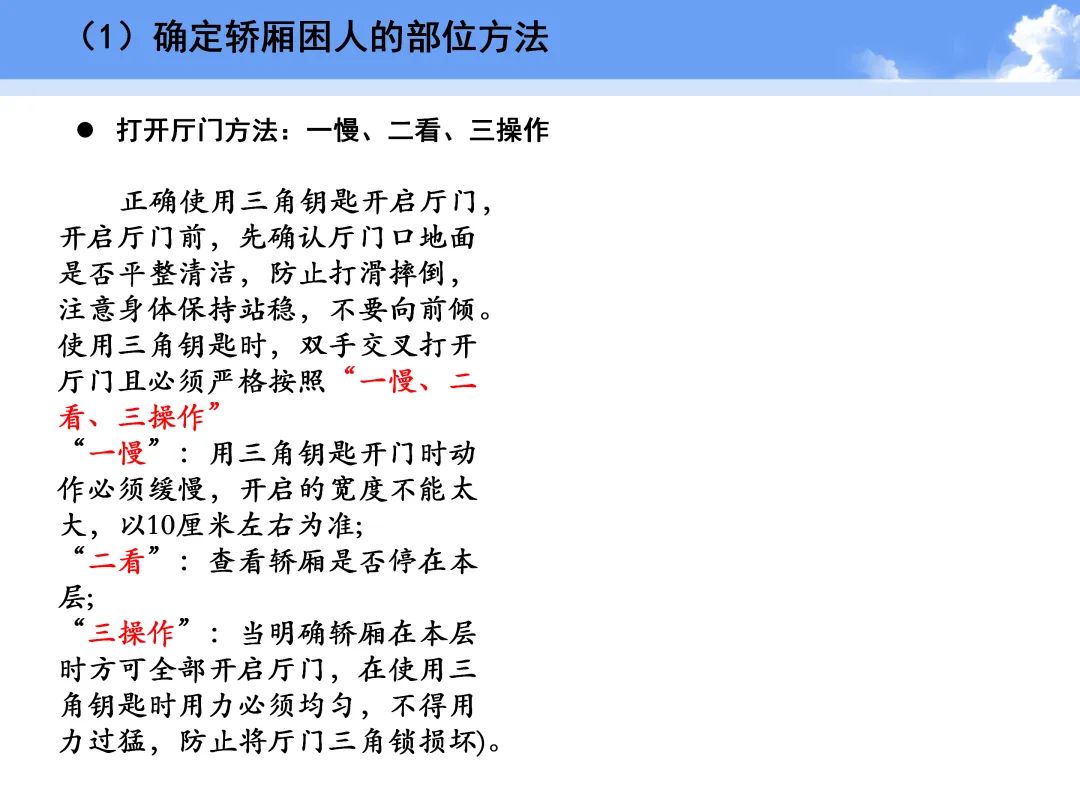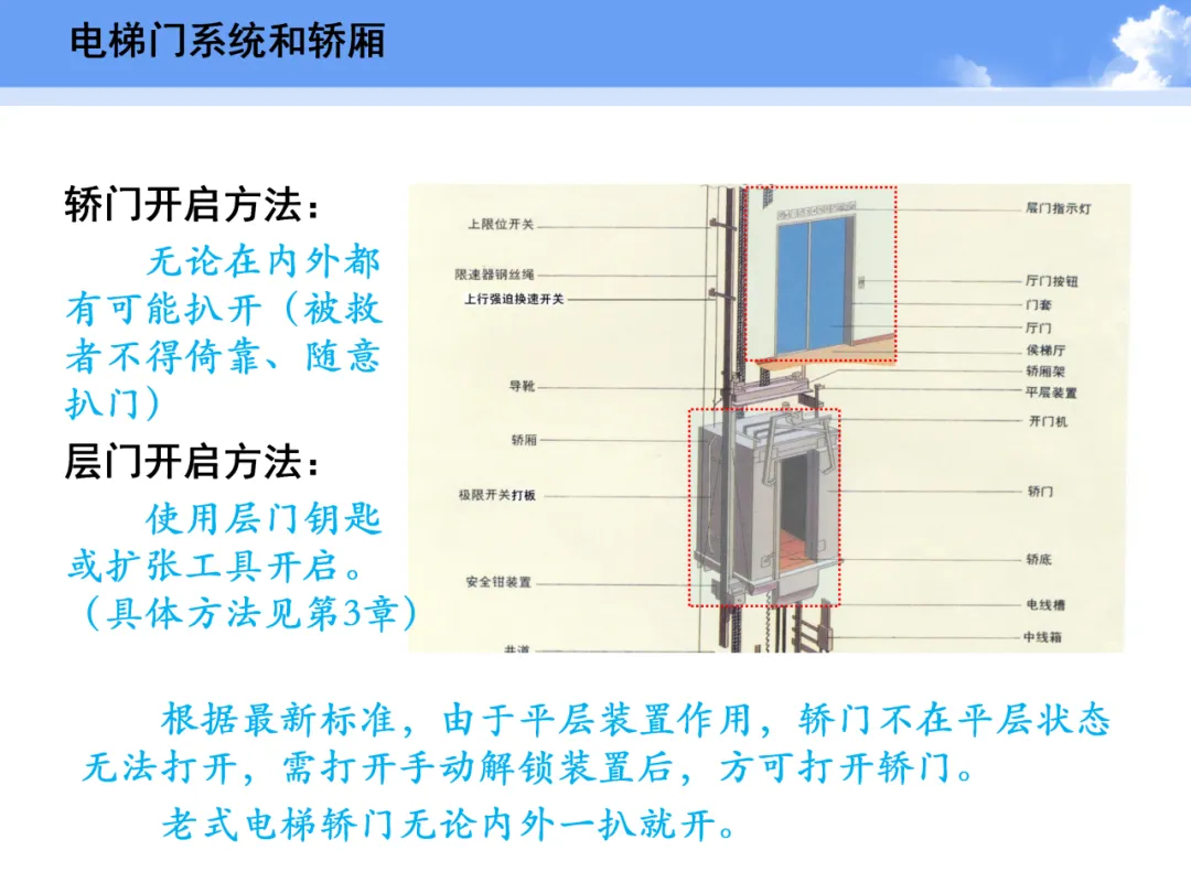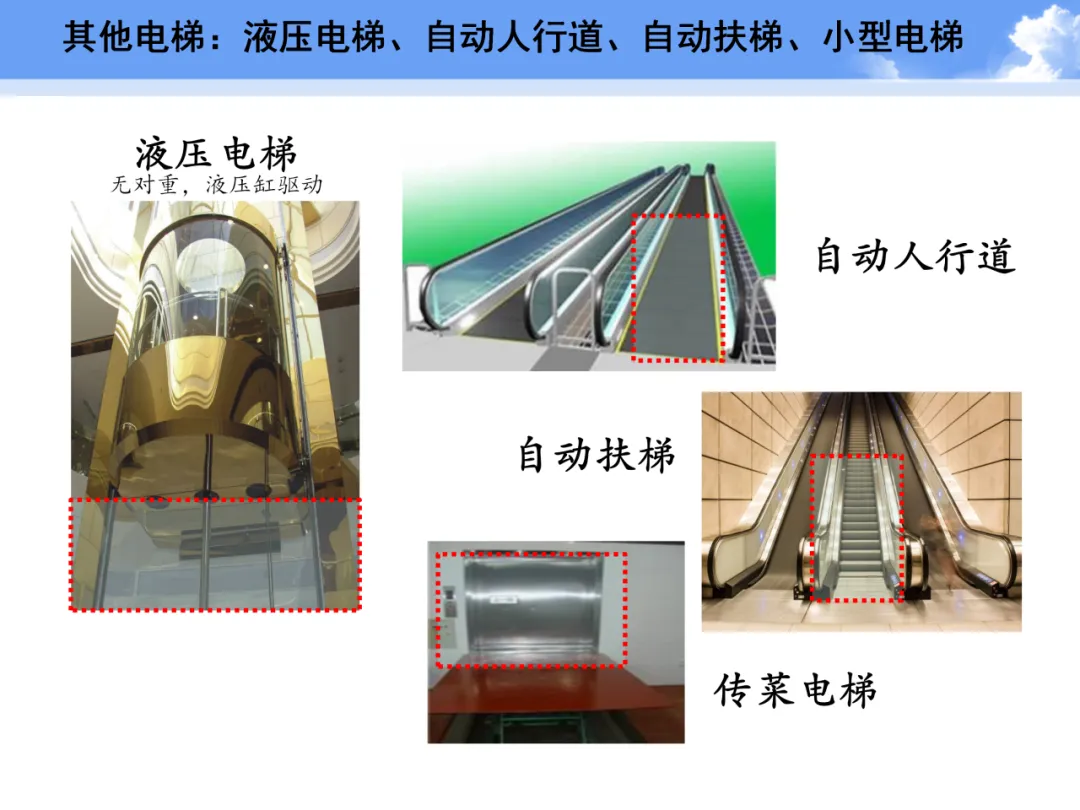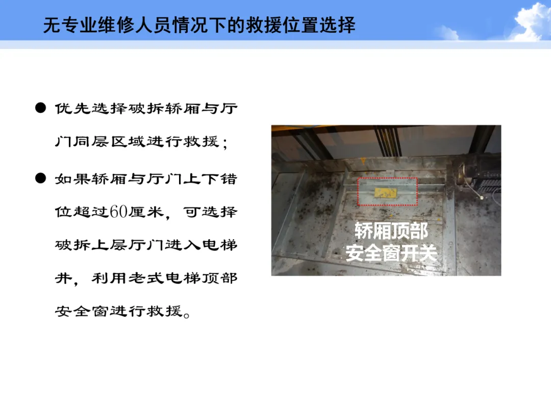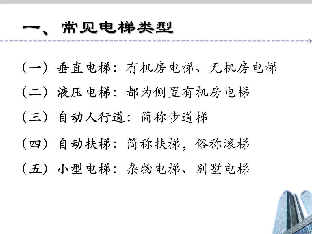 主旨内容:该课件介绍常见电梯类型(垂直、液压、自动人行道等)及基本构造,重点讲解轿厢困人、电梯井坠落、剪切等事故的救援方法,含轿厢位置确定、断电、警戒设置等操作要点,还说明了消防电梯的使用方法与注意事项,指导规范开展电梯救援工作。