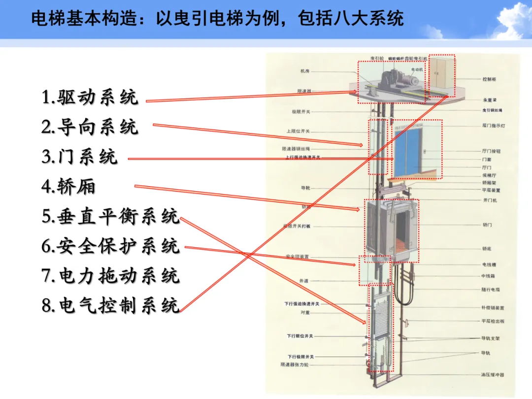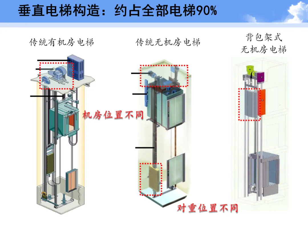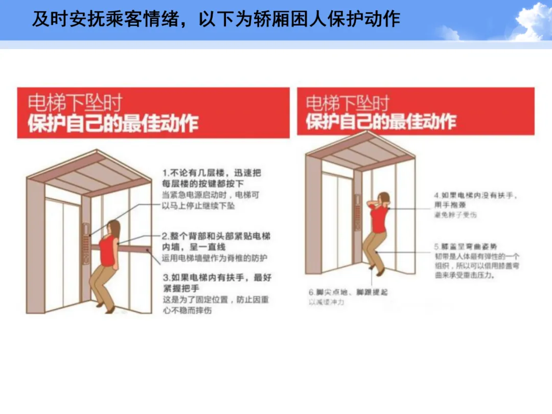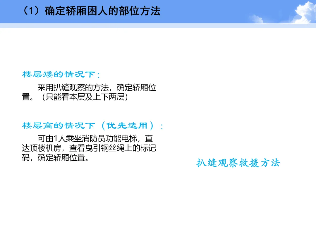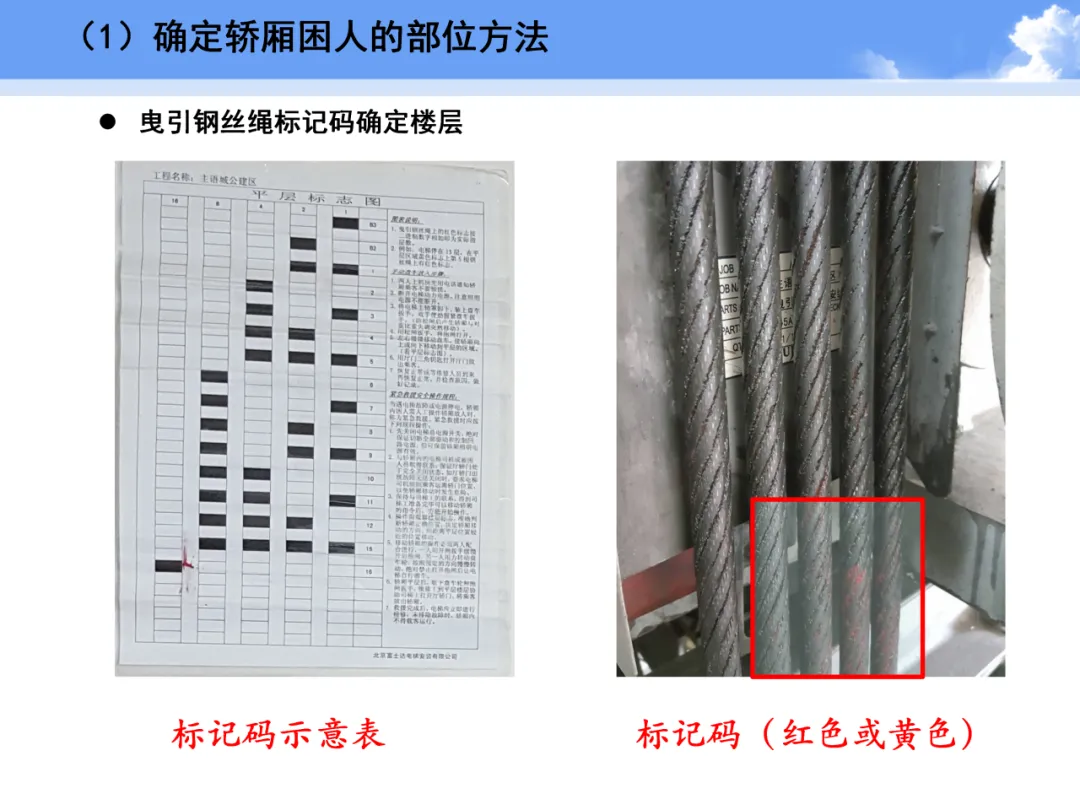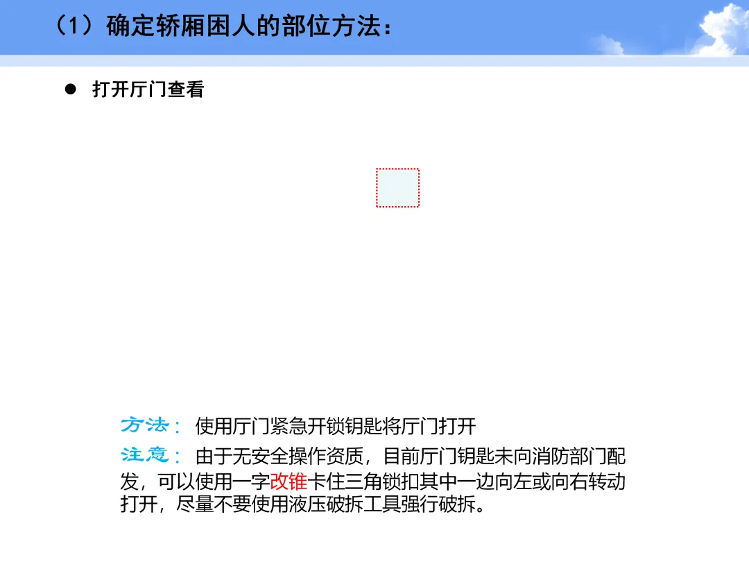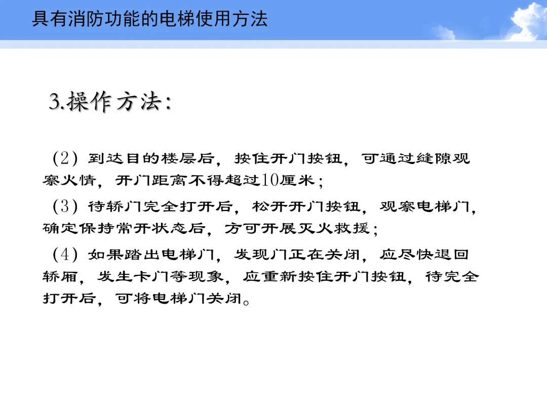 主旨内容:该课件介绍常见电梯类型(垂直、液压、自动人行道等)及基本构造,重点讲解轿厢困人、电梯井坠落、剪切等事故的救援方法,含轿厢位置确定、断电、警戒设置等操作要点,还说明了消防电梯的使用方法与注意事项,指导规范开展电梯救援工作。
