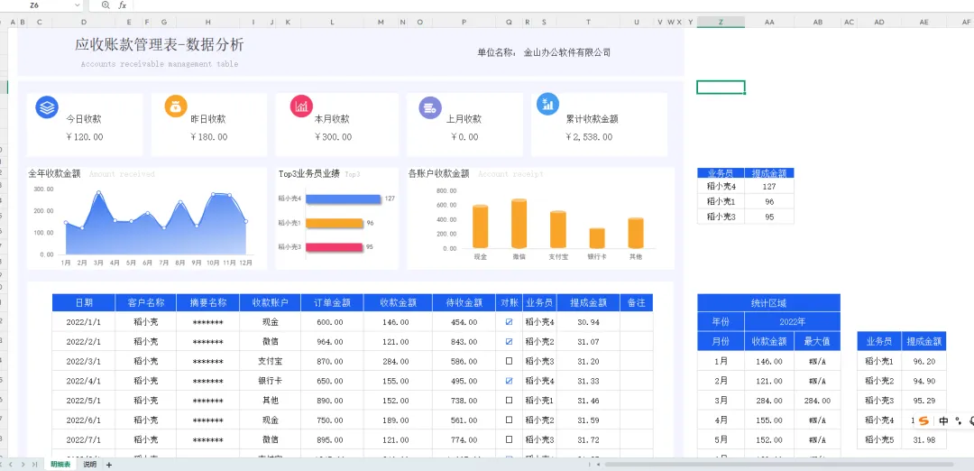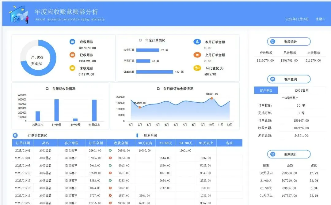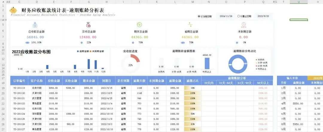 各位财务人员,今天小帮手在本文就跟大家带来了一套应收应付会计人员常用的应收账款明细表模板,套用后,应收账款账龄自动计算、回款自动监控、还自动生成应收账款分析表,操作简单,财务人员一键套用即可。具体的操作界面展示在下文了,需要的可以仔细看看。