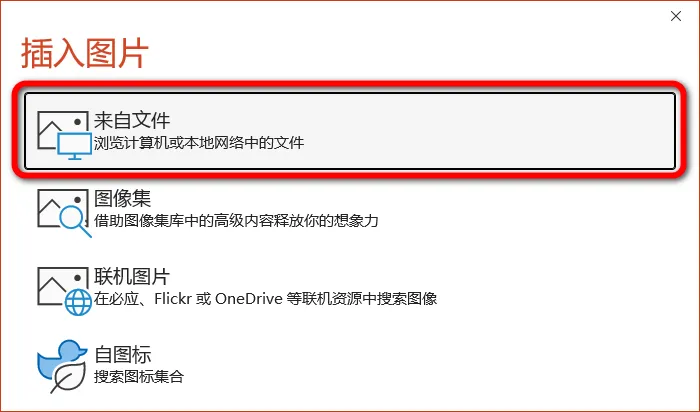 在弹出的「插入图片」对话框中,选择「来自文件」。