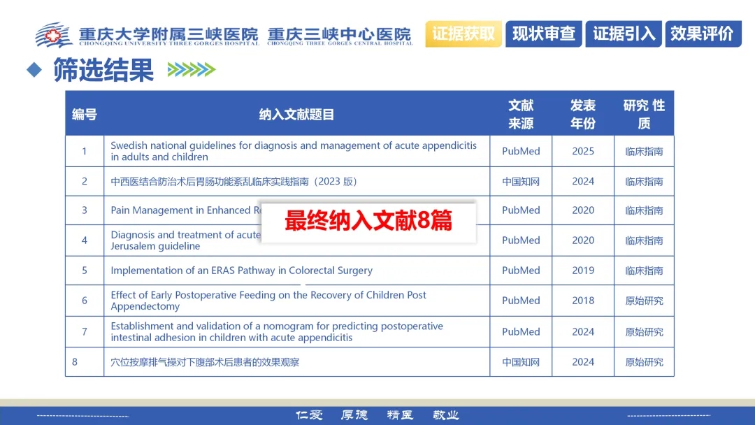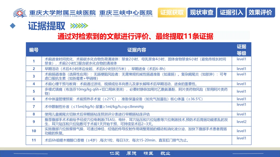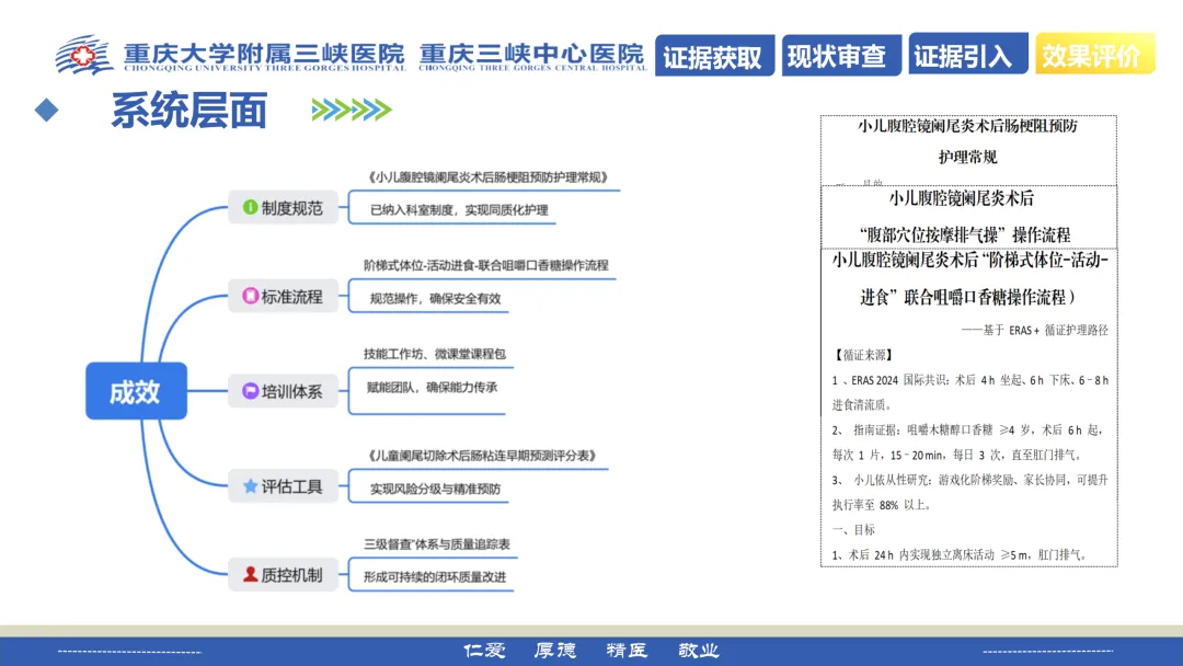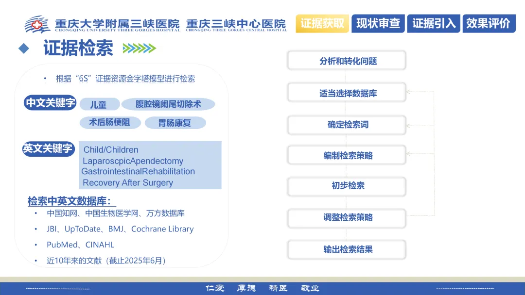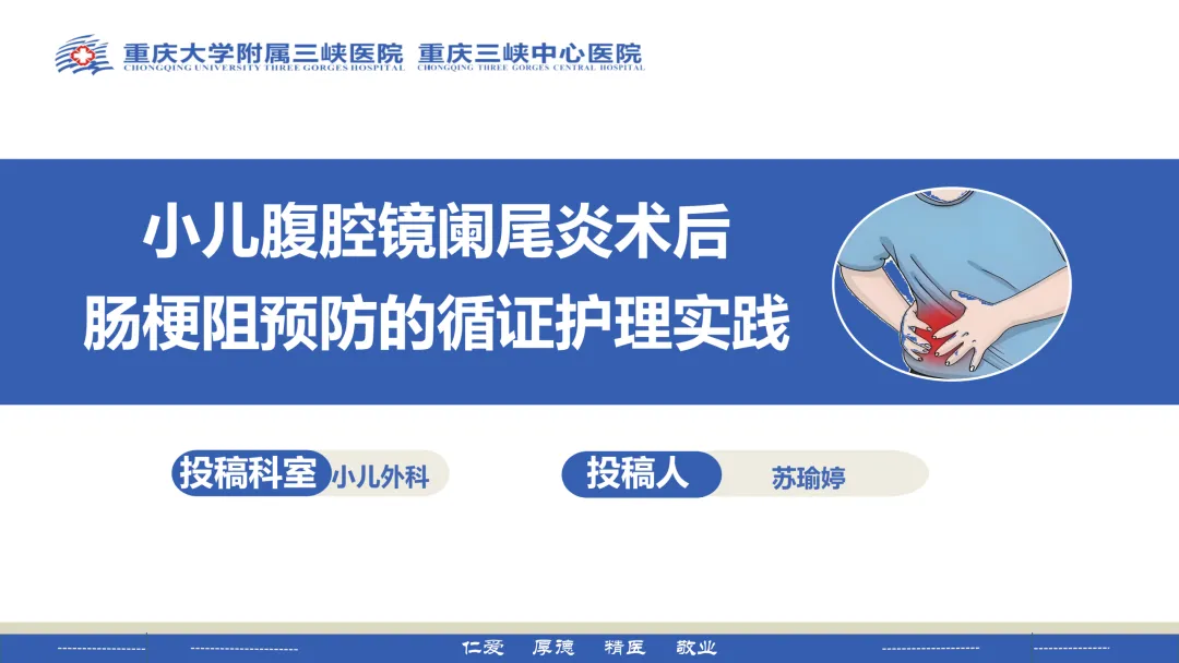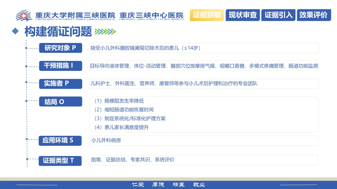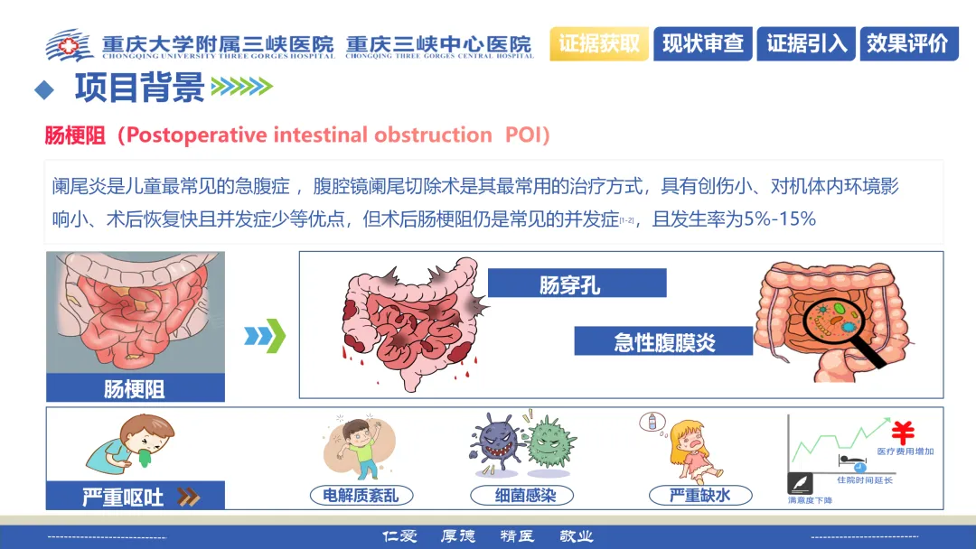 阑尾炎是儿童最常见的急腹症,腹腔镜阑尾切除术因创伤小、恢复快成为首选术式,但术后肠梗阻(POI)发生率仍达 5%-15%,易引发肠穿孔、急性腹膜炎等严重并发症,临床还存在早期干预机制缺失、护理方案标准化不足、多学科协作断层等问题。基于 “健康中国 2030” 政策要求,我院围绕≤14 岁腹腔镜阑尾切除术后患儿,开展肠梗阻预防的循证护理实践研究,旨在降低 POI 发生率、缩短肠道功能恢复时间,构建标准化护理方案。