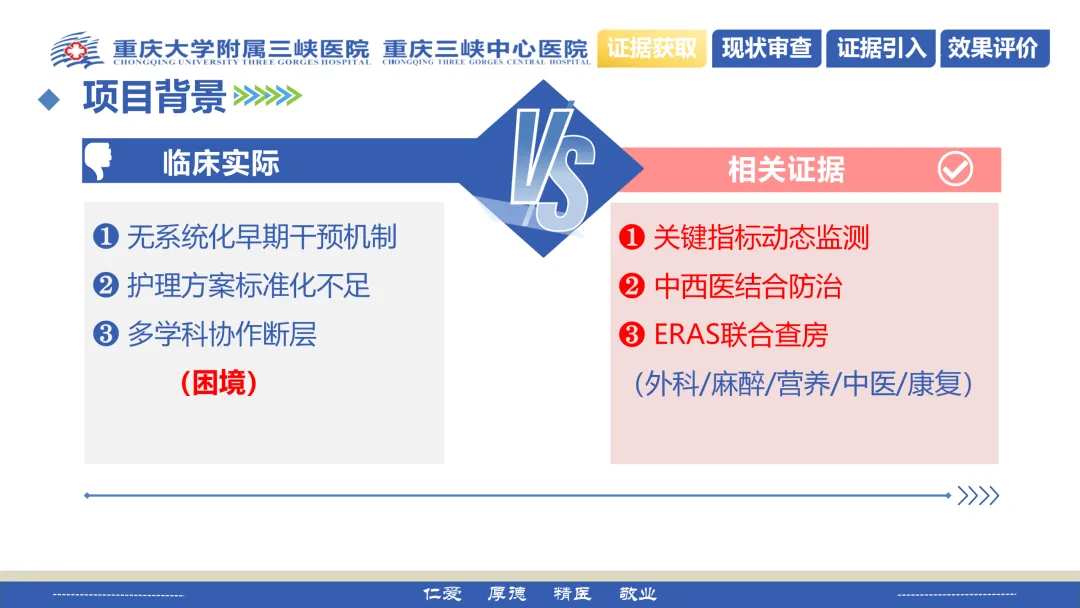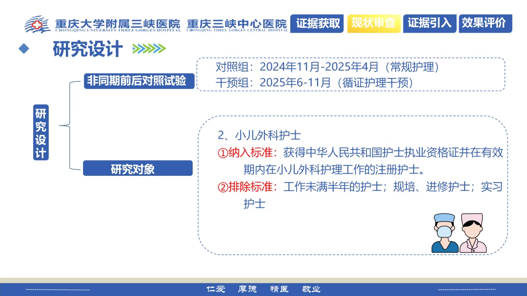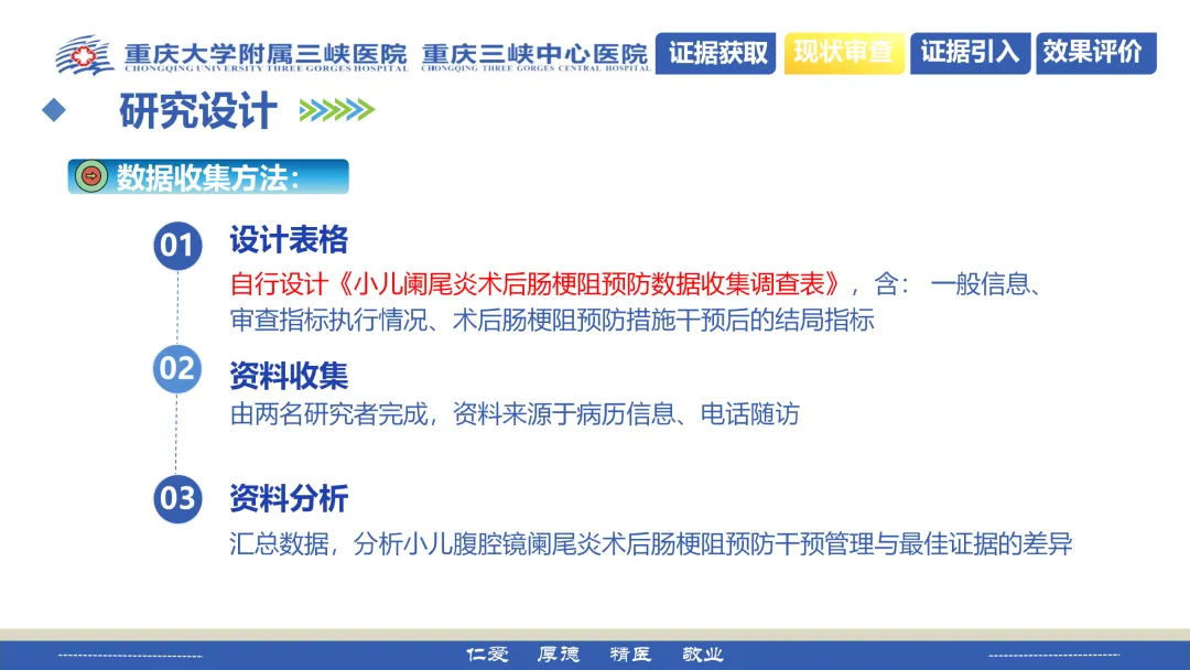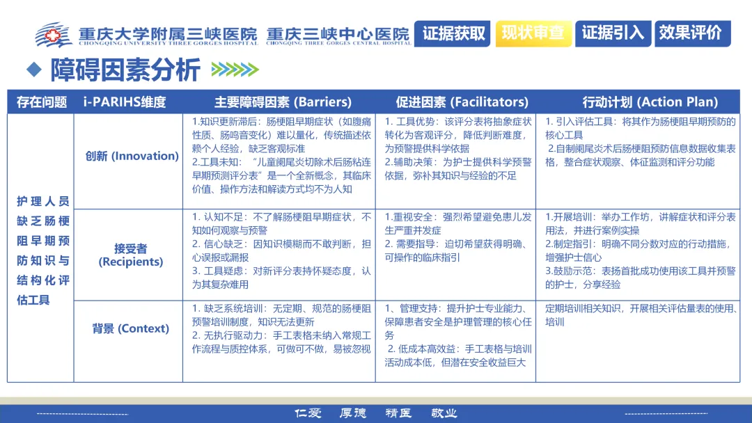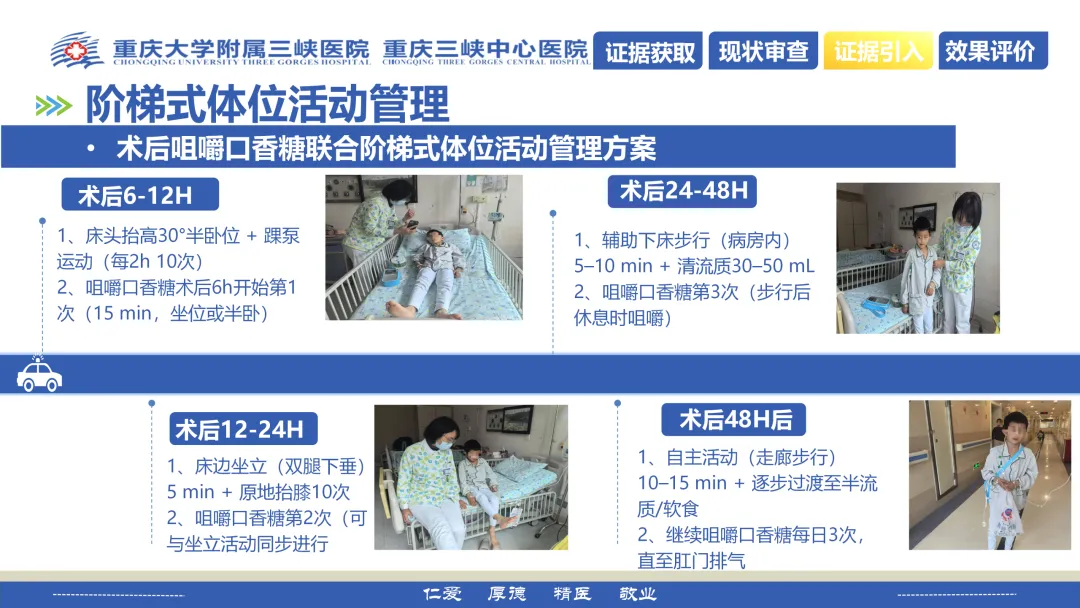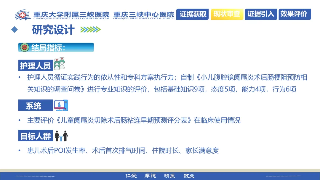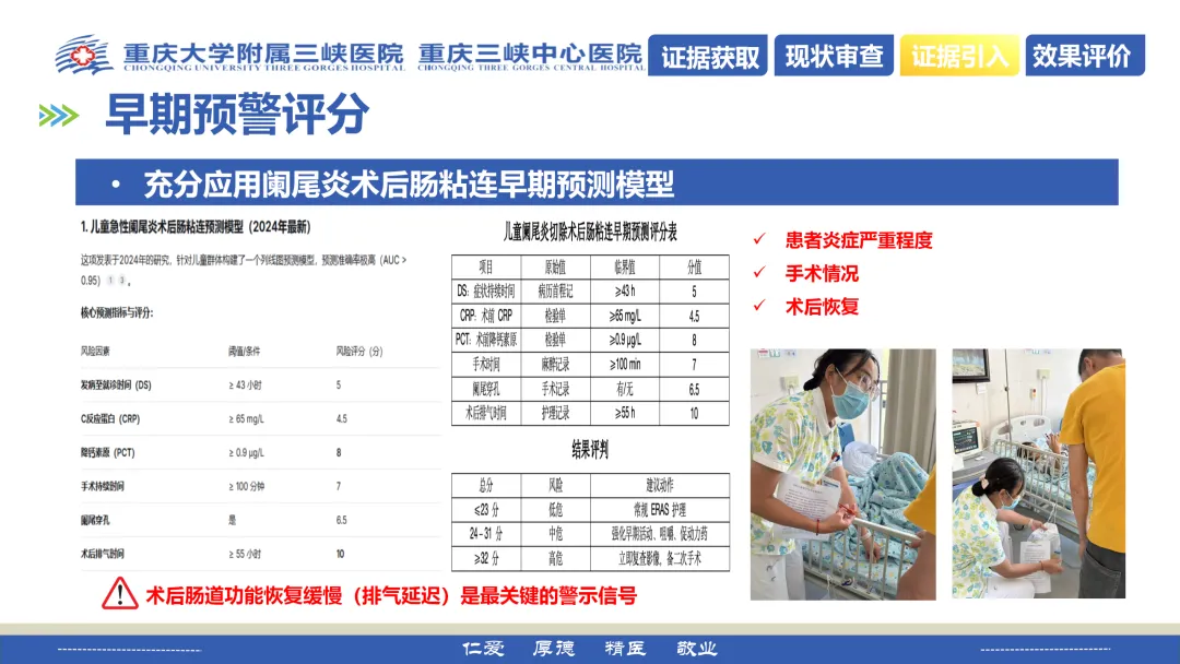 阑尾炎是儿童最常见的急腹症,腹腔镜阑尾切除术因创伤小、恢复快成为首选术式,但术后肠梗阻(POI)发生率仍达 5%-15%,易引发肠穿孔、急性腹膜炎等严重并发症,临床还存在早期干预机制缺失、护理方案标准化不足、多学科协作断层等问题。基于 “健康中国 2030” 政策要求,我院围绕≤14 岁腹腔镜阑尾切除术后患儿,开展肠梗阻预防的循证护理实践研究,旨在降低 POI 发生率、缩短肠道功能恢复时间,构建标准化护理方案。