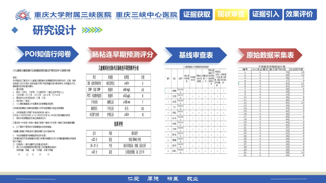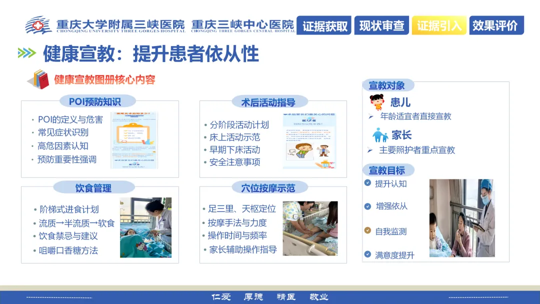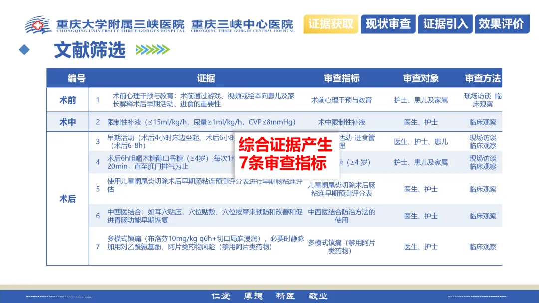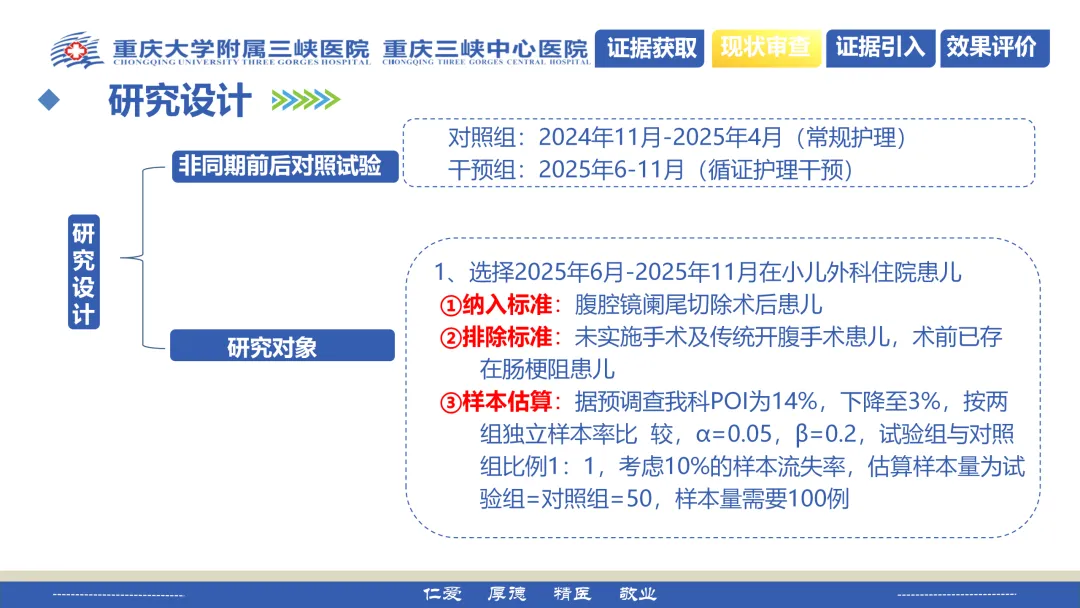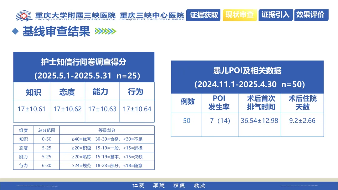 研究遵循 JBI 循证卫生保健模式,依据 “6S” 证据金字塔模型,检索 8 大中外数据库近 10 年文献,经去重、筛选及质量评价,最终纳入 8 篇高质量文献,提取 11 条证据并经 FAME 评价筛选出 8 条最佳证据,转化为 7 项可操作的临床审查指标。采用非同期前后对照试验,设常规护理对照(2024.11-2025.4)与循证护理干预组(2025.6-2025.11),每组各 50 例患儿。2025 年 5 月基线审查显示,4 项审查指标执行率≤50%(3 项为 0),患儿 POI 发生率 14%,术后首次排气时间 36.54±12.98h,住院时长 9.2±2.66d。