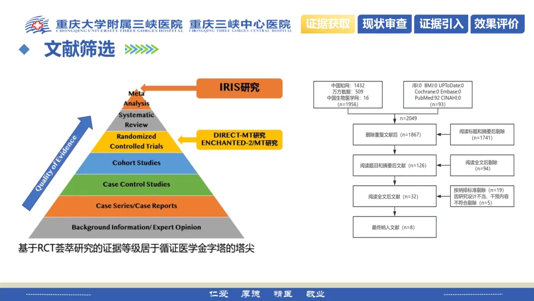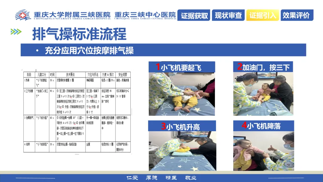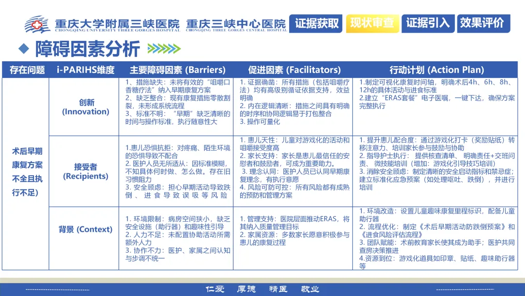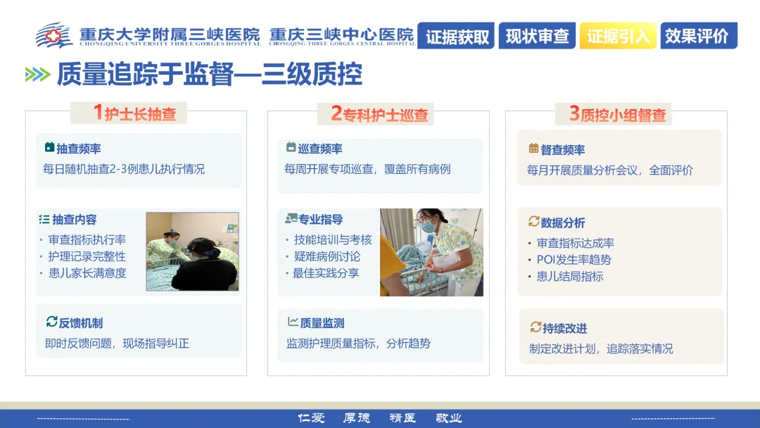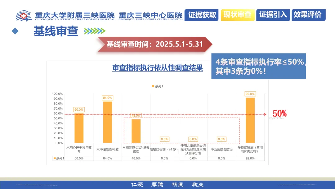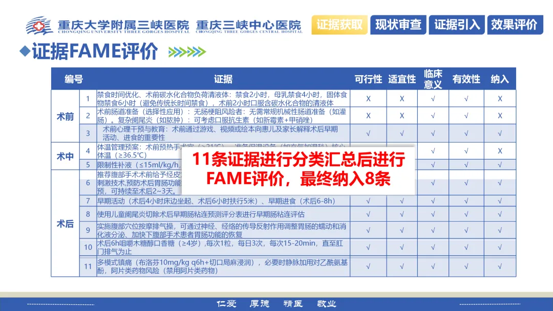 研究遵循 JBI 循证卫生保健模式,依据 “6S” 证据金字塔模型,检索 8 大中外数据库近 10 年文献,经去重、筛选及质量评价,最终纳入 8 篇高质量文献,提取 11 条证据并经 FAME 评价筛选出 8 条最佳证据,转化为 7 项可操作的临床审查指标。采用非同期前后对照试验,设常规护理对照(2024.11-2025.4)与循证护理干预组(2025.6-2025.11),每组各 50 例患儿。2025 年 5 月基线审查显示,4 项审查指标执行率≤50%(3 项为 0),患儿 POI 发生率 14%,术后首次排气时间 36.54±12.98h,住院时长 9.2±2.66d。