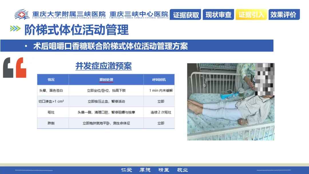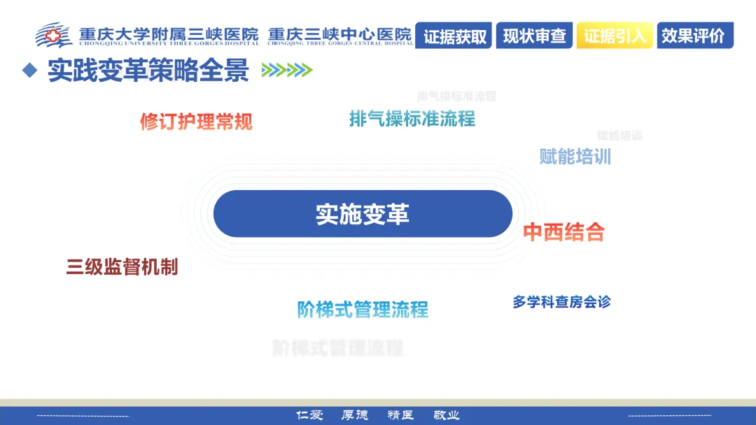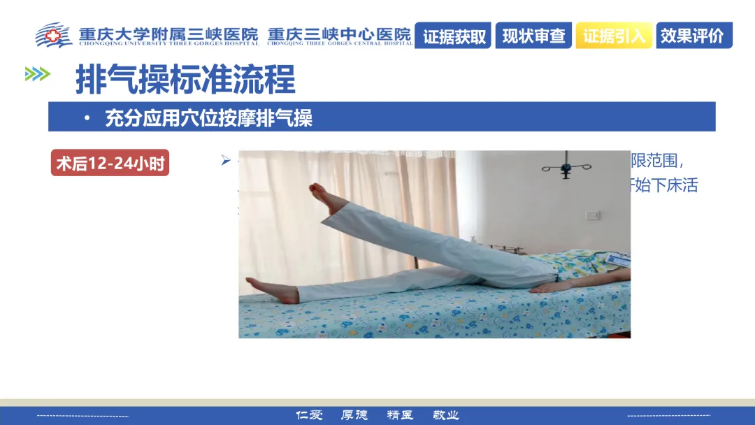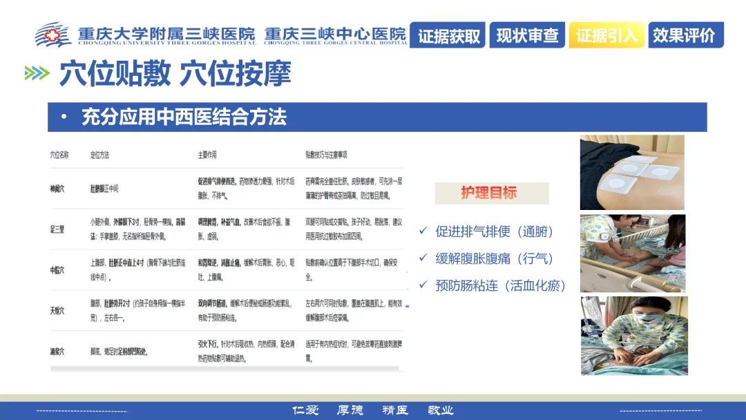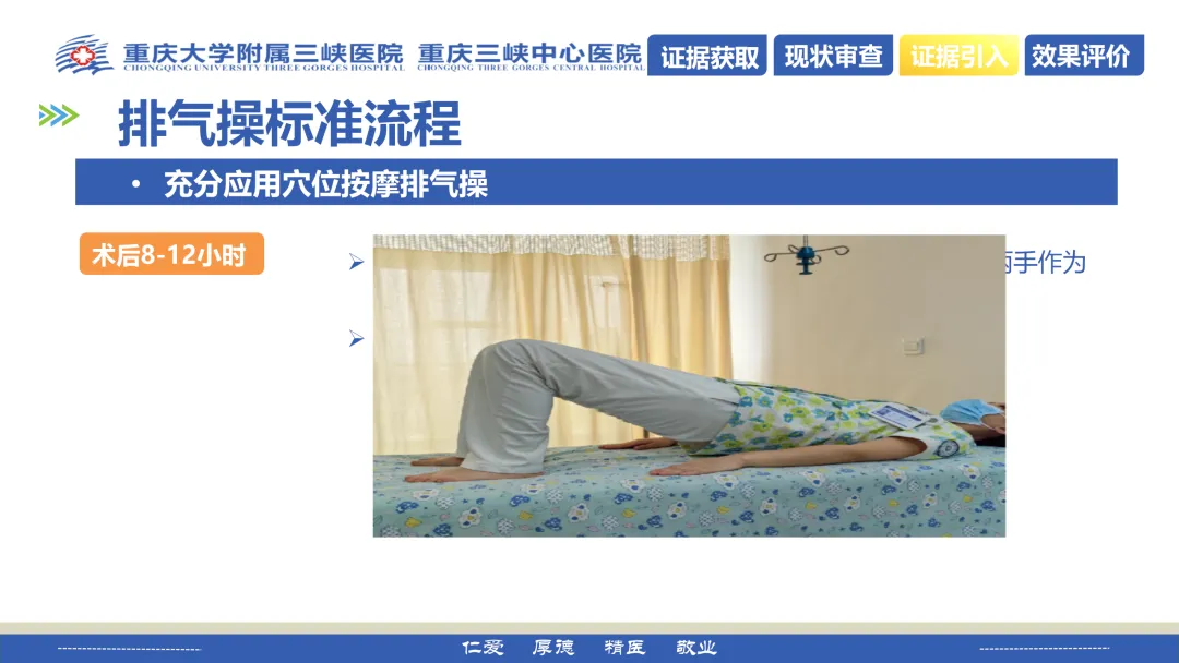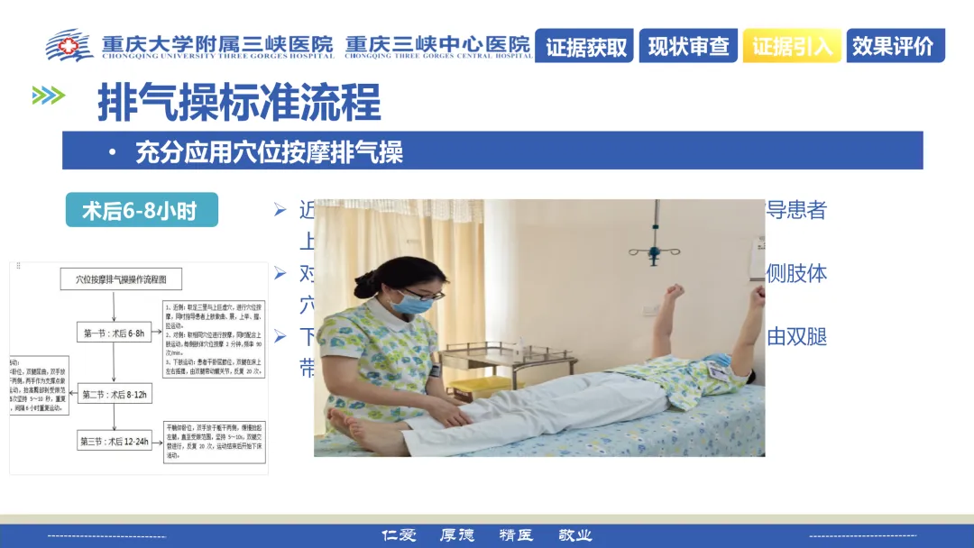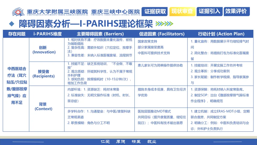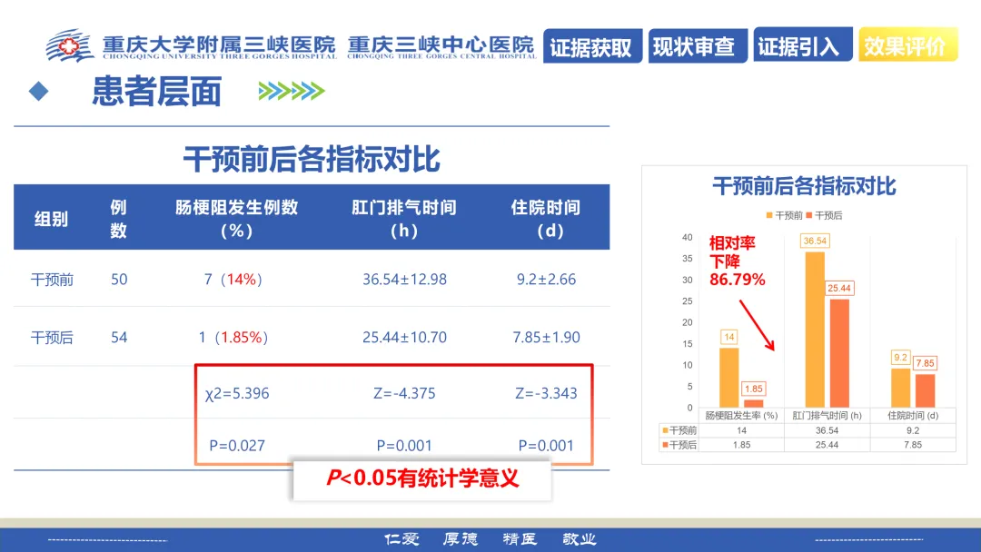 基于 I-PARIHS 理论框架剖析障碍因素后,实施六大核心干预策略:开展护士赋能培训,制定咀嚼口香糖联合阶梯式体位活动管理方案,规范腹部穴位按摩排气操标准流程,应用肠粘连早期预测评分表实现风险分层,采用穴位贴敷 + 按摩的中西医结合护理,建立护士长 - 专科护士 - 质控小组三级质控体系,并组建外科、麻醉、中医等多学科协作团队开展联合查房。