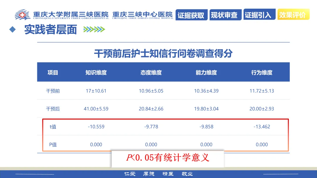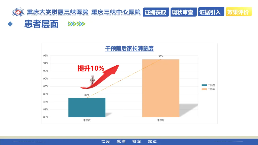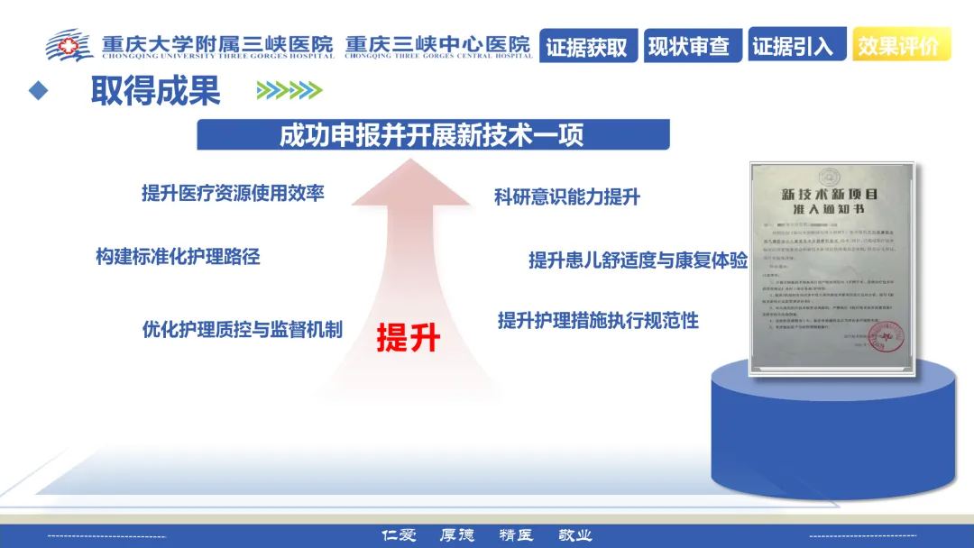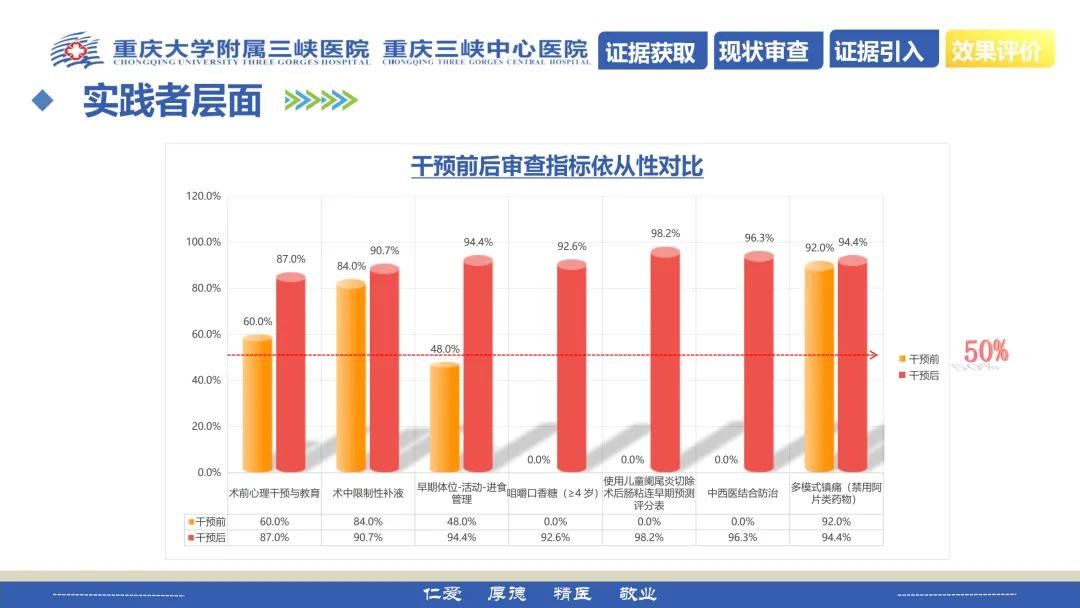 经 6 个月干预,实践取得显著成效:患儿 POI 发生率降至 1.85%,术后首次排气时间、住院时长均显著缩短,家长满意度提升 10%;护士循证知信行能力大幅提高,7 项审查指标执行率均超 87%。同时成功构建标准化护理常规与路径,申报新技术 1 项,形成闭环质控体系,实现了循证证据向临床实践的有效转化,提升了小儿腹腔镜阑尾炎术后护理质量与医疗资源利用效率。