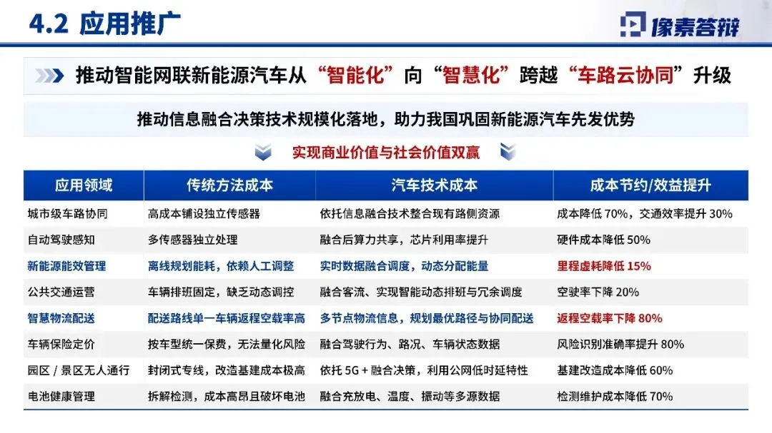 成果已落地城市车路协同、自动驾驶感知、新能源能效管理、智慧物流等领域。实际数据显示:城市车路协同成本降低70%,交通效率提升30%;自动驾驶硬件成本降低50%;电池健康检测成本降低70%;公共交通空驶率下降20%,返程空载率下降80%。项目有力推动产业从“智能化”向“智慧化”跨越,实现商业与社会价值双赢。