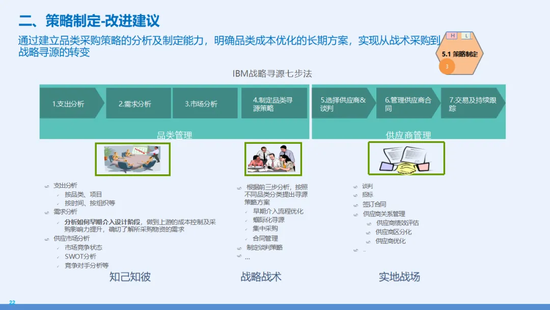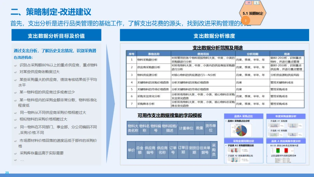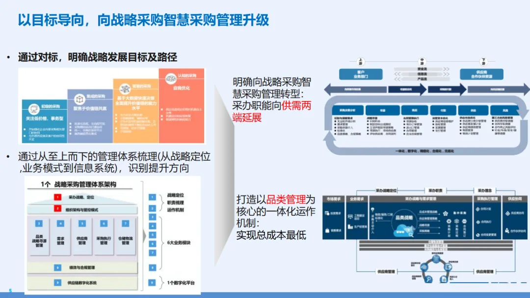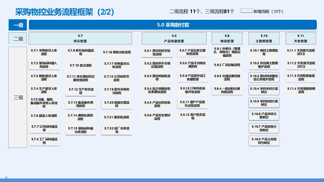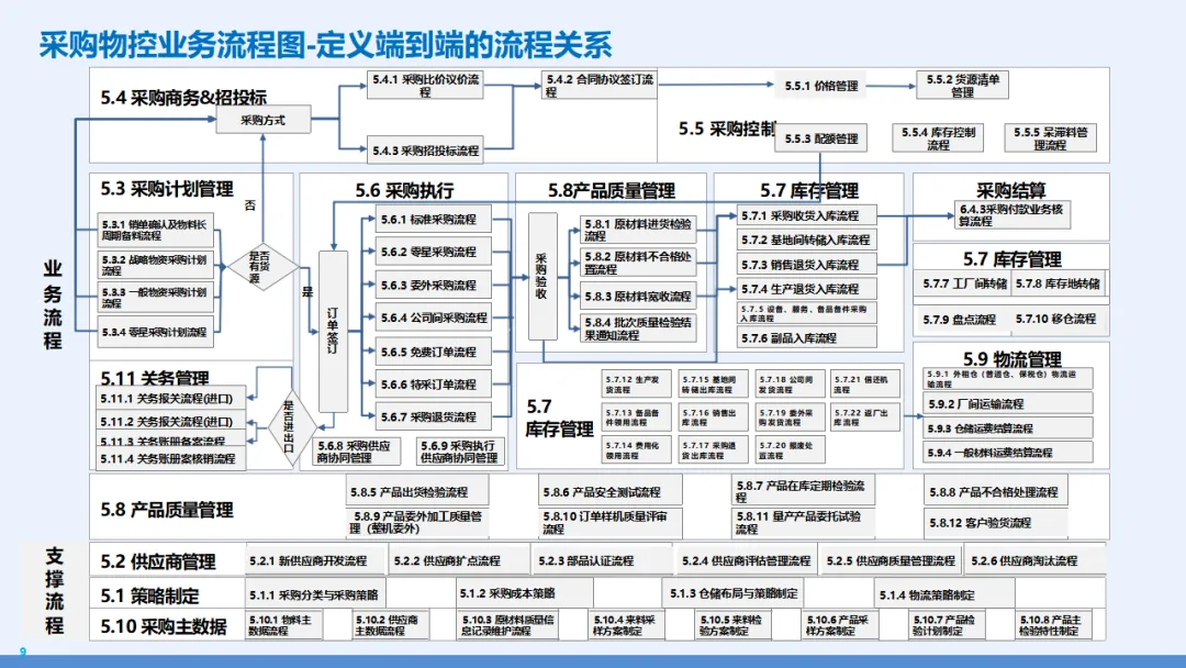 本方案围绕制造业采购供应链“低成本、高齐套”核心愿景,构建从战略到执行的端到端全流程蓝图,推动采购从事务型向集成化、智慧化升级。方案以品类管理为核心,覆盖策略制定、供应商管理、采购计划、商务招投标、采购执行、库存与质量管理、物流关务、主数据等全模块,形成11个二级流程、81个三级流程的完整体系,明确各环节权责与流转规范。