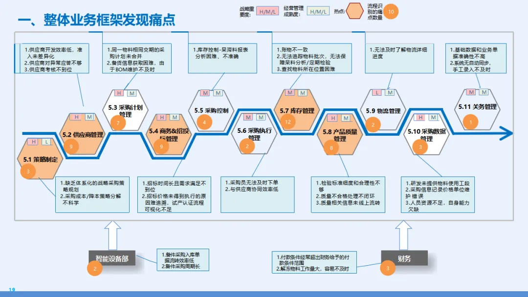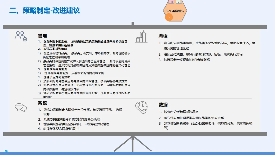 方案通过全面需求调研与痛点分析,识别出供应商管理粗放、寻源效率低、库存呆滞高、质量闭环不足、系统数据割裂等关键问题,针对性提出四大改进方向:组织上优化职能定位,强化品类与供应商全生命周期差异化管理;流程上完善寻源、招标、入库、退货、呆滞处理等闭环机制;数据上规范物料与供应商主数据,启用批次管理提升追溯能力;系统上深化SRM、ERP、WMS集成,实现流程线上化与自动化。