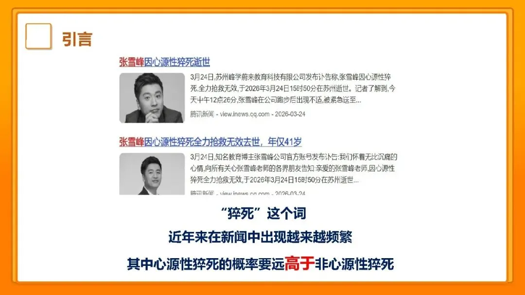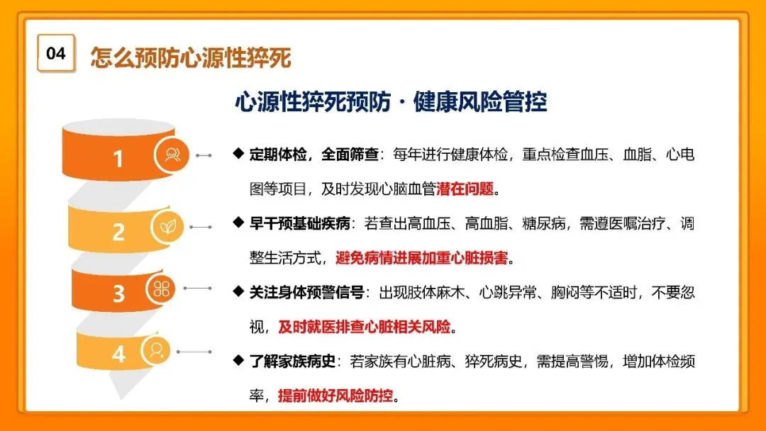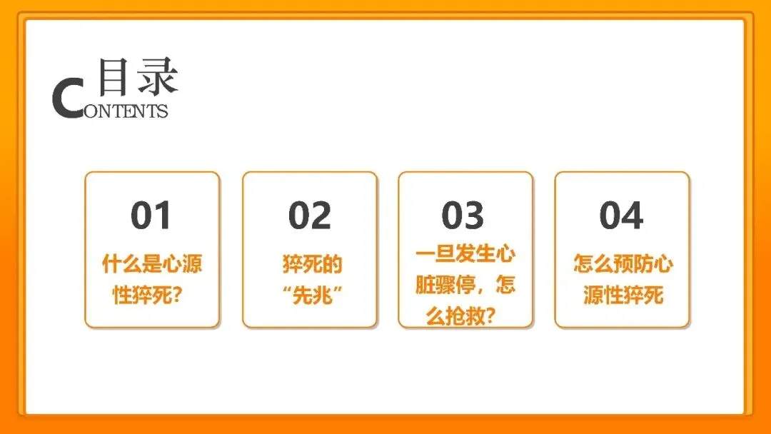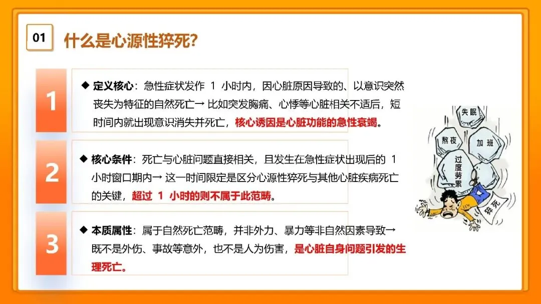 各位朋友,大家好!今天我们一起来学习心源性猝死的相关知识,这是一个和我们每个人生命健康都息息相关的话题,接下来我会结合 PPT 的内容,用专业又通俗的话和大家聊一聊,从什么是心源性猝死,到它的先兆、急救方法,再到如何预防,一步步讲清楚。