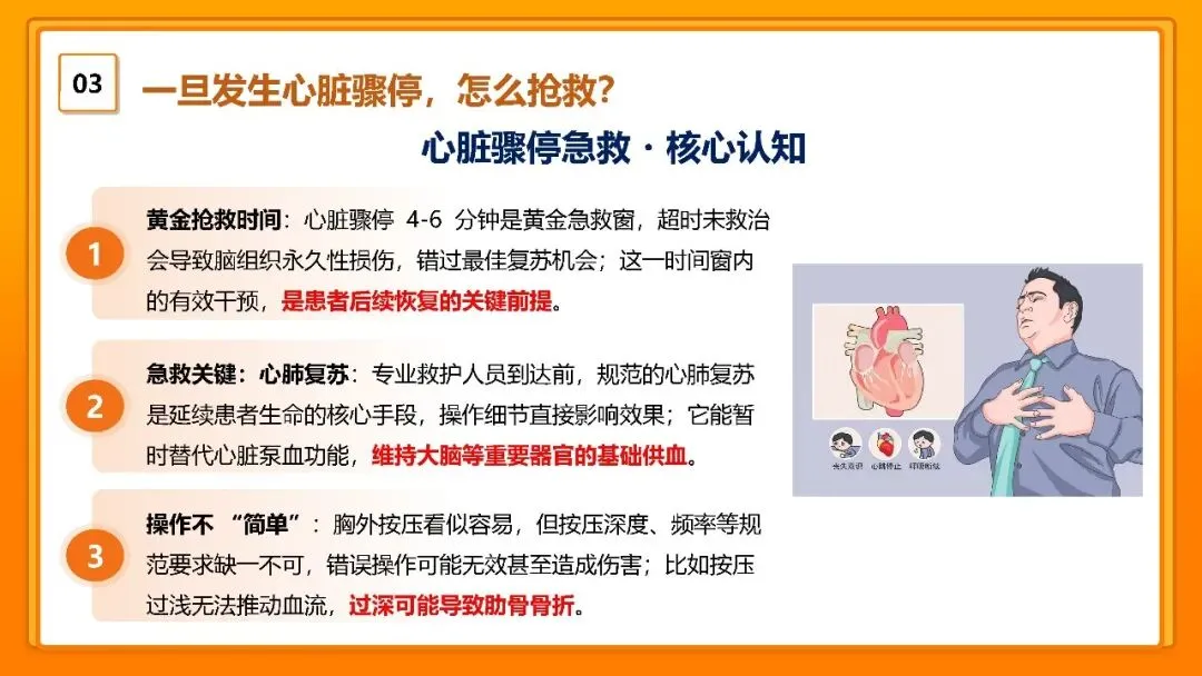 记牢黄金抢救时间:心脏骤停后 4-6 分钟,超时会导致脑组织永久性损伤,复苏成功率大幅下降。