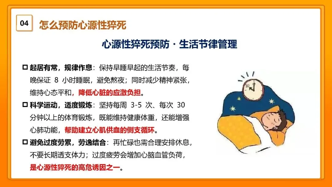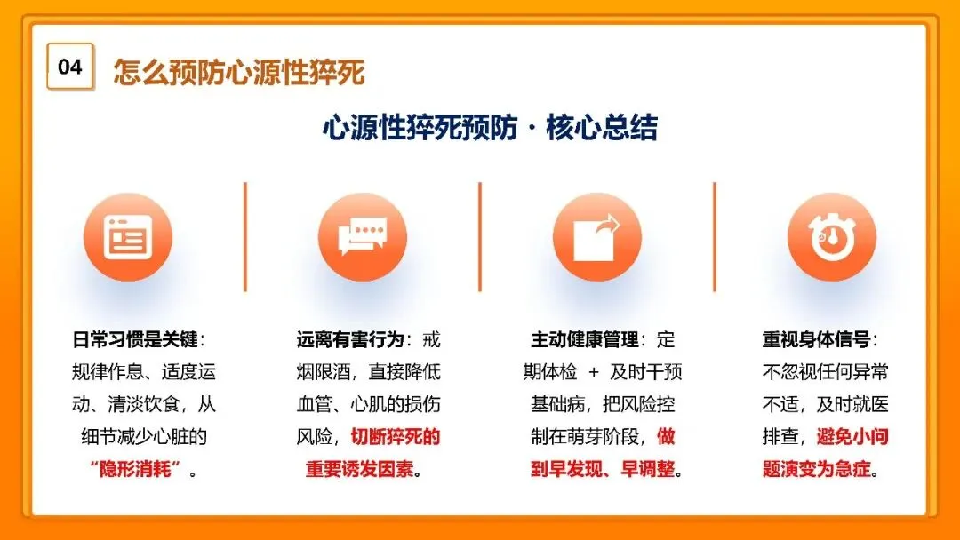 急救是补救,预防才是从根源上规避风险,核心就做好四方面。第一,管理生活节律。第二,管好饮食健康。第三,做好健康管控。第四,牢记预防核心。