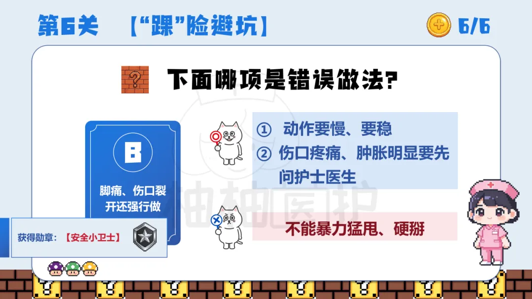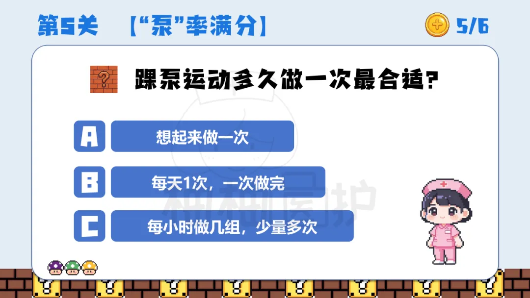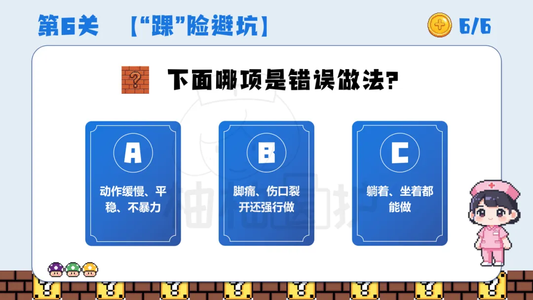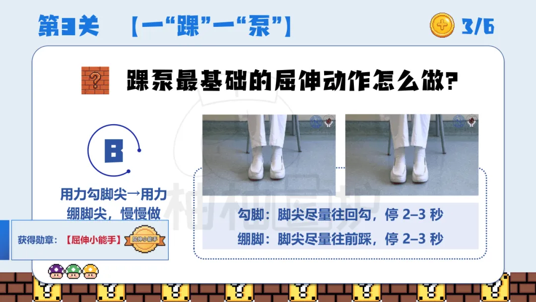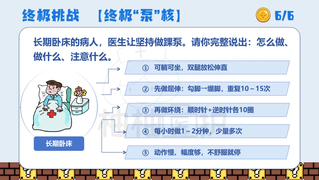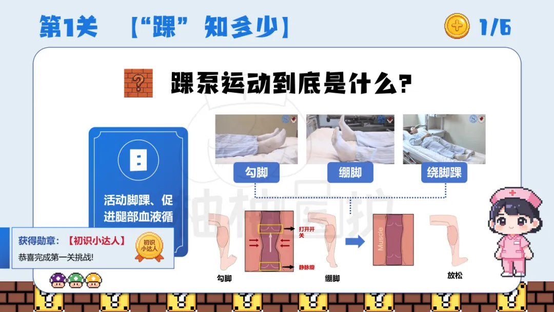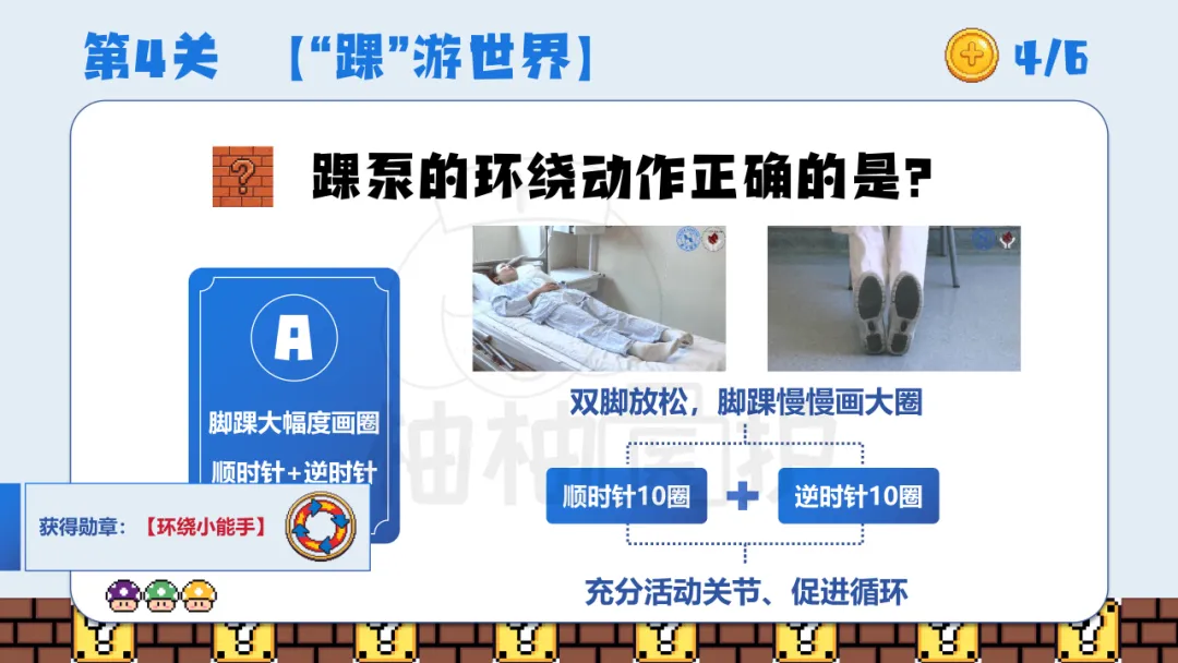 本文以6 关知识闯关形式,趣味讲解踝泵运动的定义、作用、屈伸动作、环绕动作、频次及注意事项,帮助患者与家属快速掌握踝泵运动,促进下肢血液循环、预防血栓,做到少量多次、安全有效。