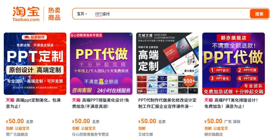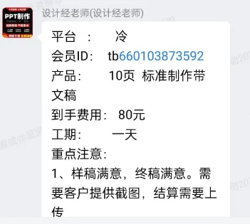 你没听错,淘宝上的PPT代做业务是完全合法合规的,每天都有上千人在淘宝找PPT代做服务。而大部分淘宝店铺,根本不会花大成本养全职设计师(还要交五险一金),大多都是招兼职,然后把兼职设计师拉到企业微信群里,有单就直接派。