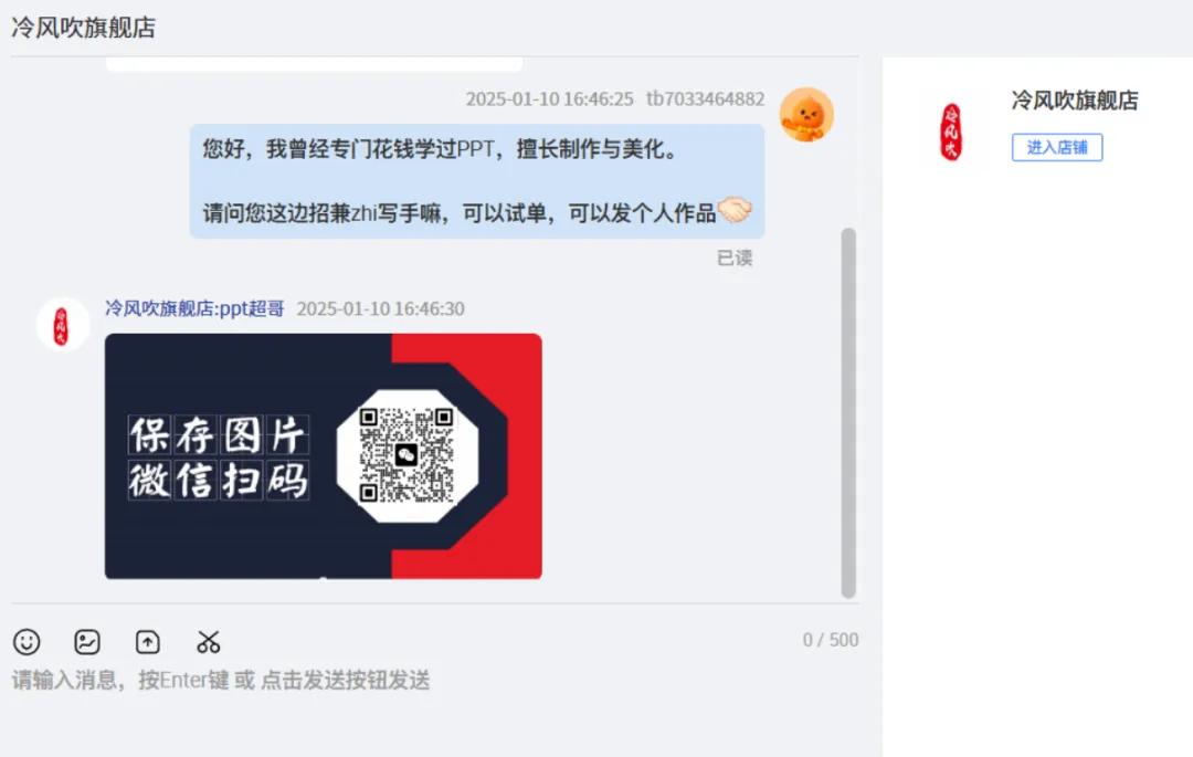操作一点都不复杂:直接在淘宝搜索“PPT设计”,找到几家口碑还不错的店铺,给客服发消息就好,话术可以参考:“我是PPT设计师,想应聘贵店的兼职设计师,可提供个人作品和简历。”