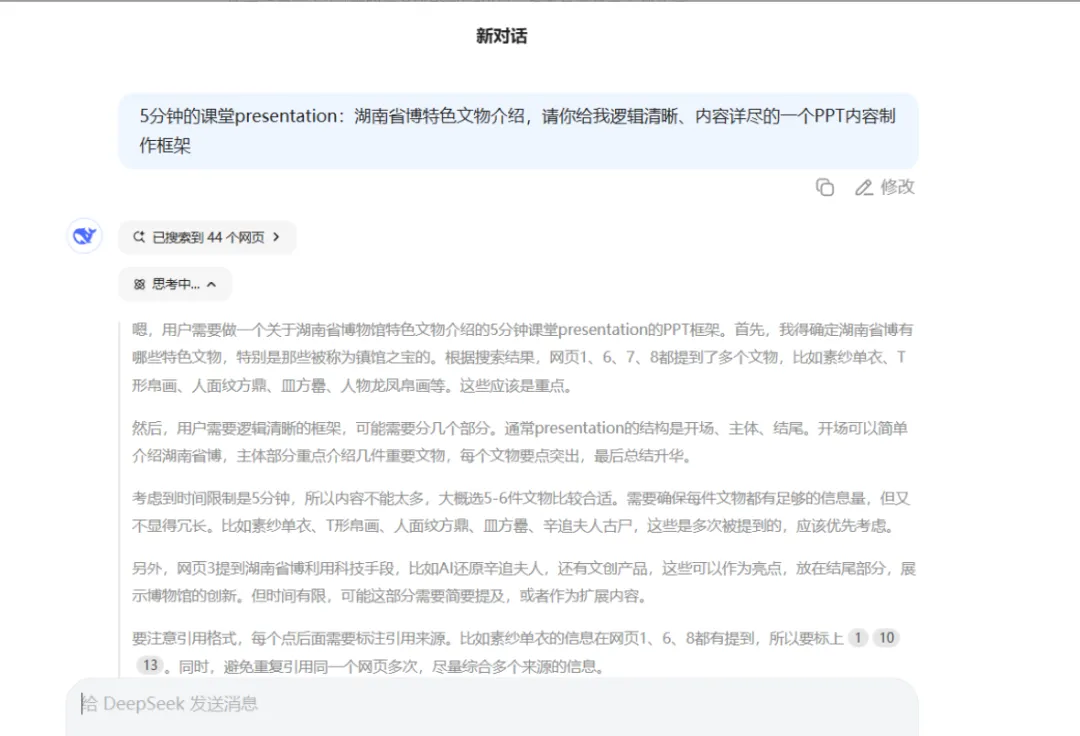 第一步:先把主题发给DeepSeek,让它帮你生成PPT的文稿框架(相当于帮你搭好骨架,不用自己费脑想结构);