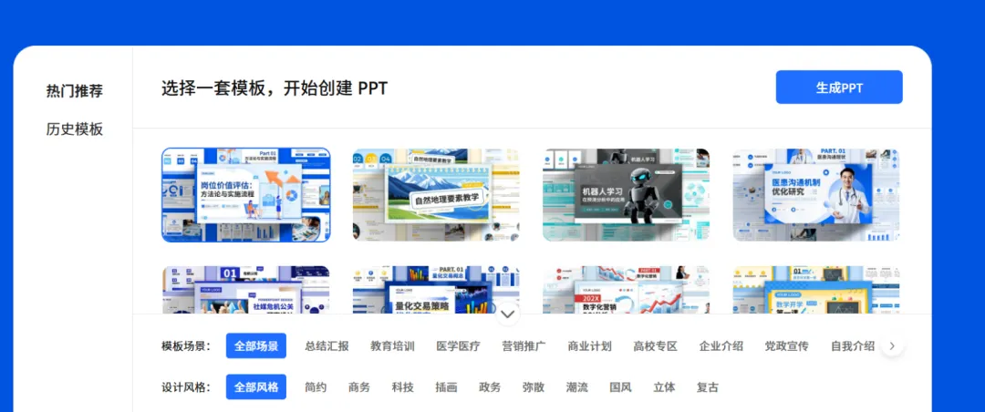 就能一键生成一个基础的PPT——虽然有点粗糙,只有模板+文字,但比自己从零开始整理文字、找模板快太多!