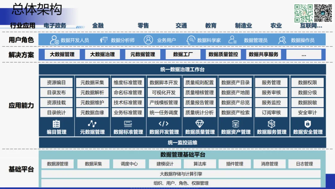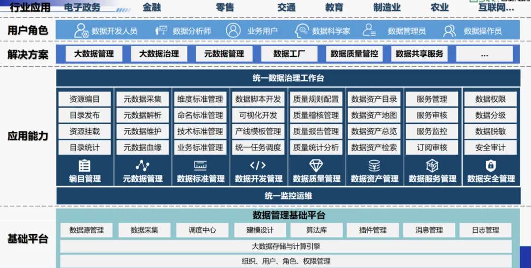 该架构具备分层清晰、能力聚合、角色明确、行业可扩展的特点,是一个典型的企业级数据治理平台设计方案,适用于政府、金融、制造、互联网等数据密集型行业。