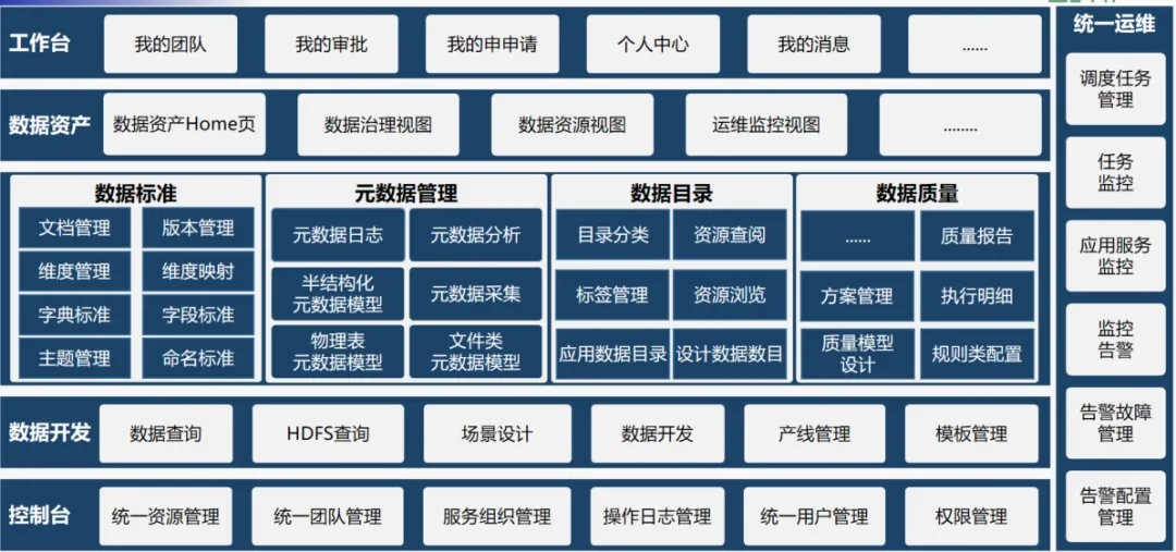 应用层:面向数据治理全流程的具体功能模块,形成治理能力中心。