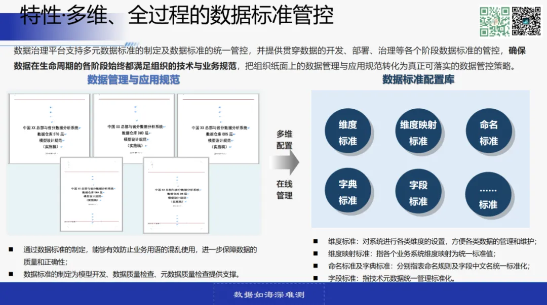 标准体系构建:支持业务标准(如客户分类)、技术标准(如字段类型长度)、管理标准(如数据安全等级)