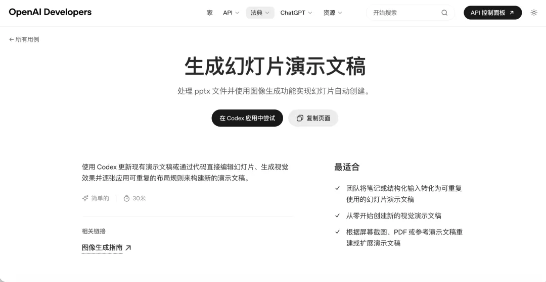 一句话先说透:Codex 做 PPT,最强的不是“生成”,而是“按规则施工”很多人对 AI 做 PPT 的理解还停留在“帮我写大纲”“帮我想标题”“帮我配几张图”。但 OpenAI 官方给 Codex 的这套幻灯片玩法,本质不是“帮你想”,而是“帮你做”。官方描述非常直接:你可以让 Codex 更新现有演示文稿,也可以新建 deck;它是通过代码直接编辑幻灯片、生成视觉素材,并且按可重复的布局规则逐页处理的。Slides skill 的定位也很明确:用 JavaScript 和 PptxGenJS 去创建、编辑 .pptx,并附带渲染和校验脚本。你真正要做的,是把它当成一个会按要求执行的PPT 生产 agent。